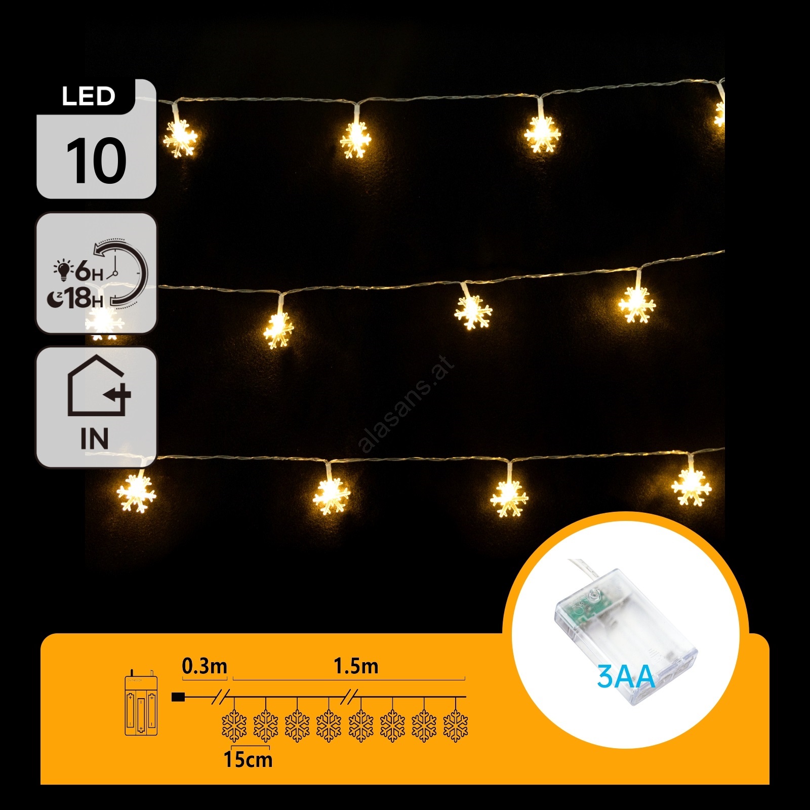 Aigostar - LED-Weihnachts-Lichterkette, 10 LEDs, 3×AA-Betrieb, 1,5 m, warmweiß, Schneeflocken-Design