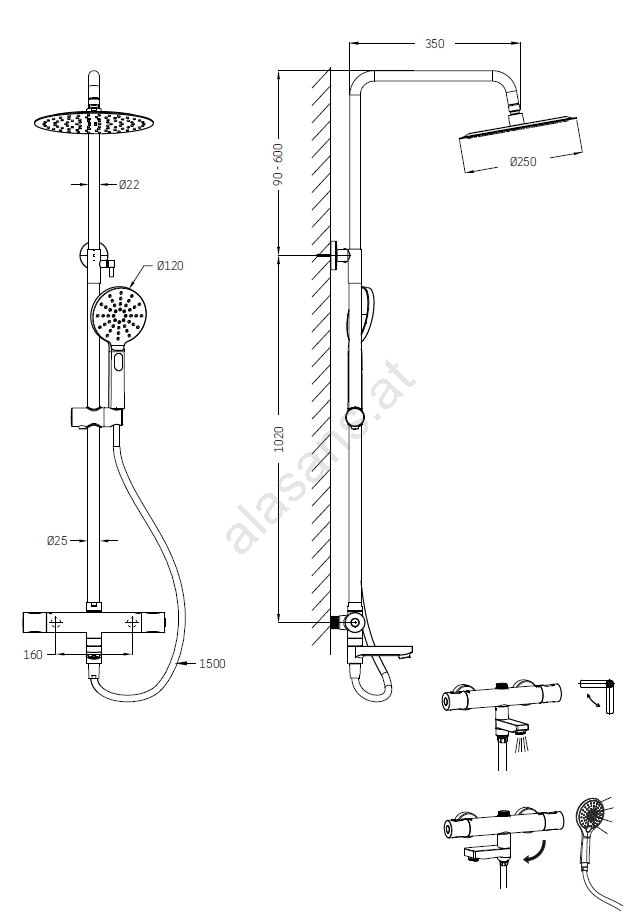 • Das Set besteht aus einem thermostatischen Mischventil aus massivem Messing.