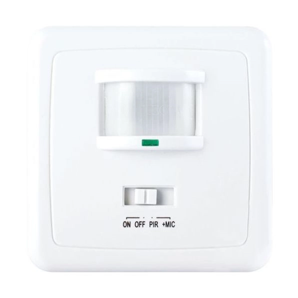 • Infrarot-(PIR-)Bewegungs- und Schallsensor aus weißem Kunststoff.