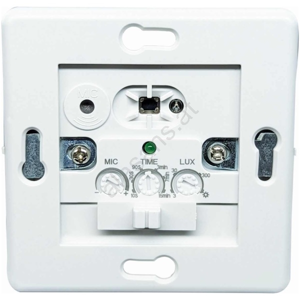 • Stufenlos einstellbar: Zeit (10 s bis 15 Minuten), Umgebungshelligkeit von 3 lx (Nachtmodus) bis 2000 lx (Tagesmodus), Mikrofonempfindlichkeit (30–90 dB).