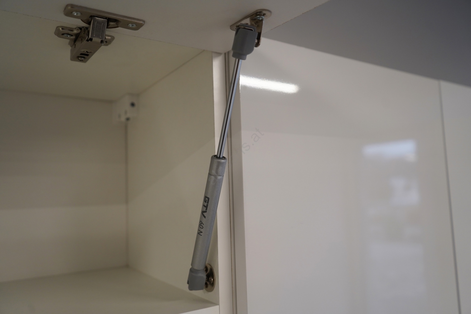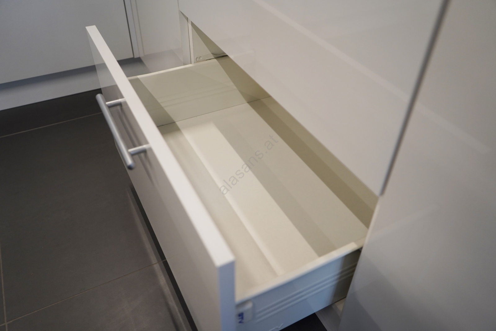 • Obere Schränke sind mit Gasdruckfedern ausgestattet, in den Schubladen sind hochwertige gekapselte, metallene Auszüge.