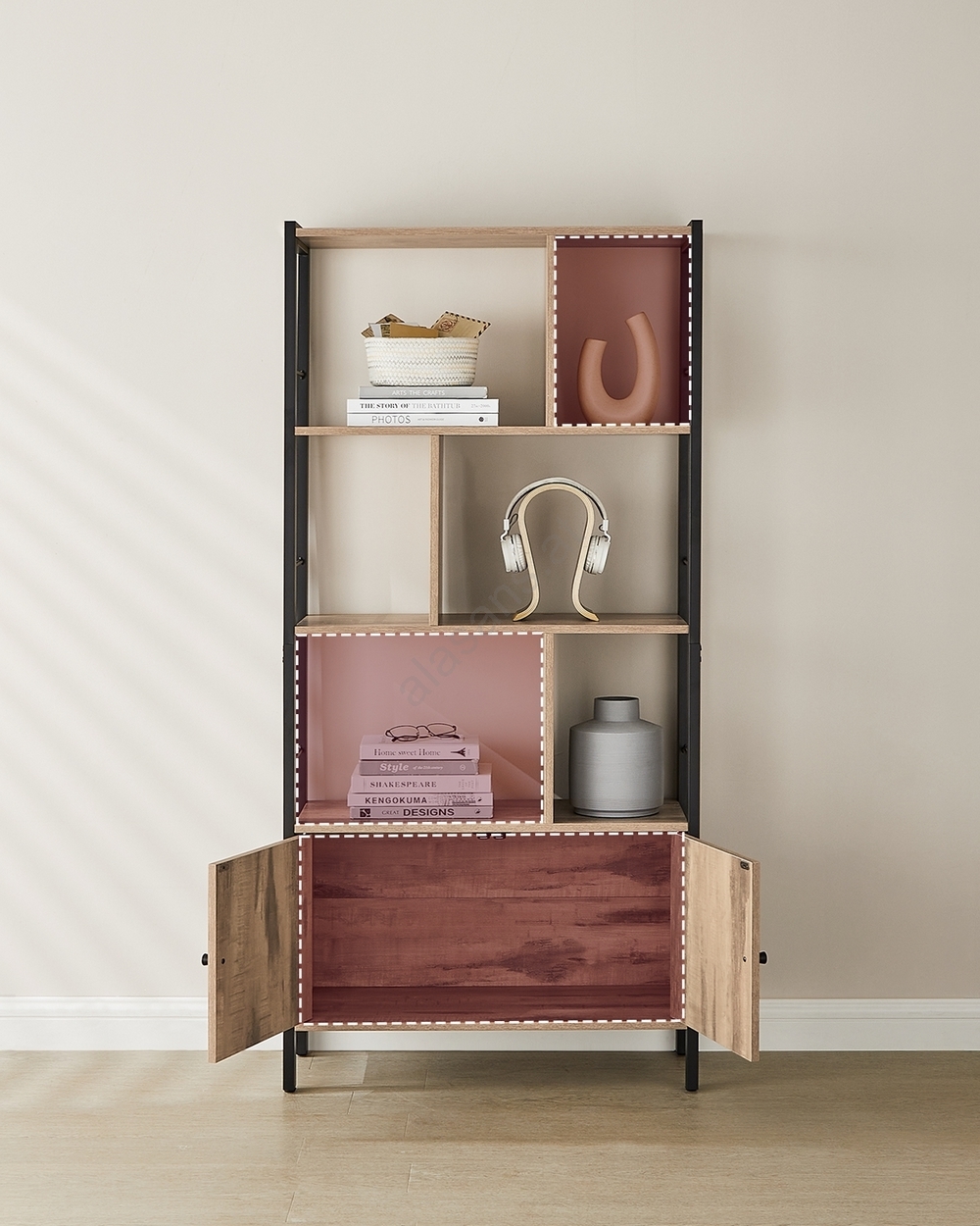 • Unter den 4 Fachböden befindet sich ein Fach mit 2 Türen, das Platz für zahlreiche Bücher, Zeitschriften und sonstige Kleinigkeiten bietet.
