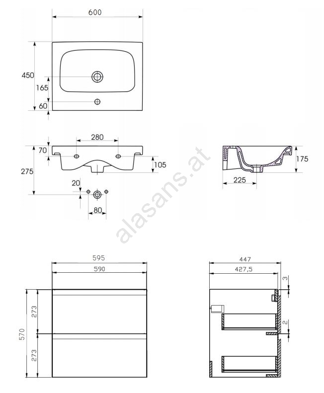 • Das Keramikwaschbecken hat eine klassische rechteckige Form mit Loch für Armatur und Überlauf.
