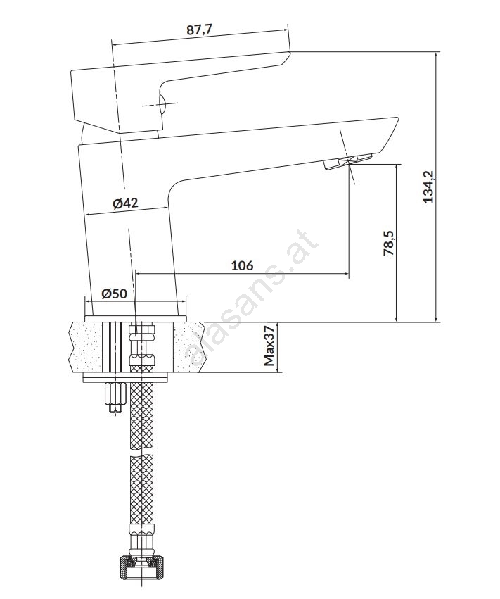 • Metall-Schnappauslauf mit Anschluss-Schläuchen ist im Lieferumfang enthalten.
