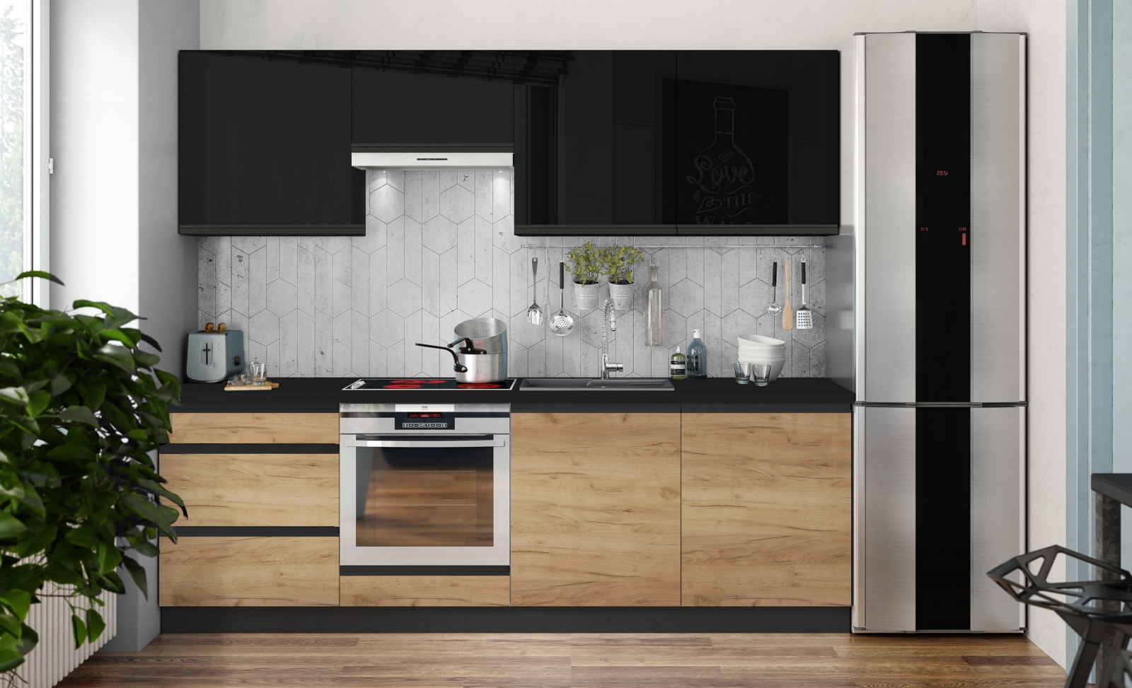• Küchenzeile MARINA 240 cm Craft-Eiche/Hochglanz-Schwarz