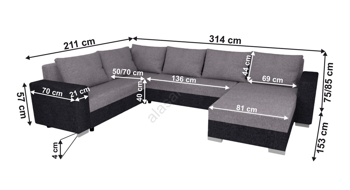 • Die Garnitur ist mit einer ausklappbaren Schlaffläche ausgestattet, die einen komfortablen Schlaf gewährleistet, sowie mit praktischem Stauraum für Bettwäsche und weiteres Zubehör.