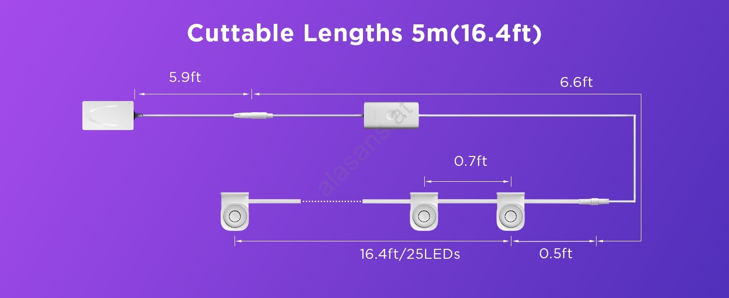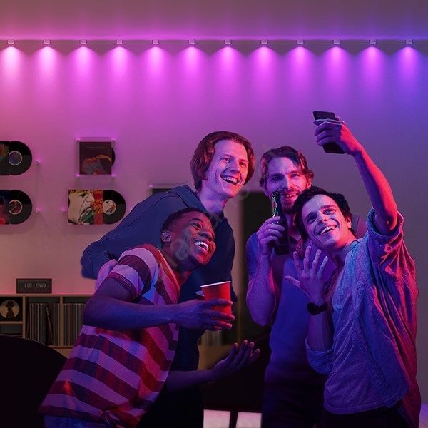 • Eine Kette aus 25 einzeln programmierbaren LED-Leuchten, verteilt auf 5 Meter Länge, verwandelt jede langweilige Wand in ein großflächiges RGB-Kunstwerk.