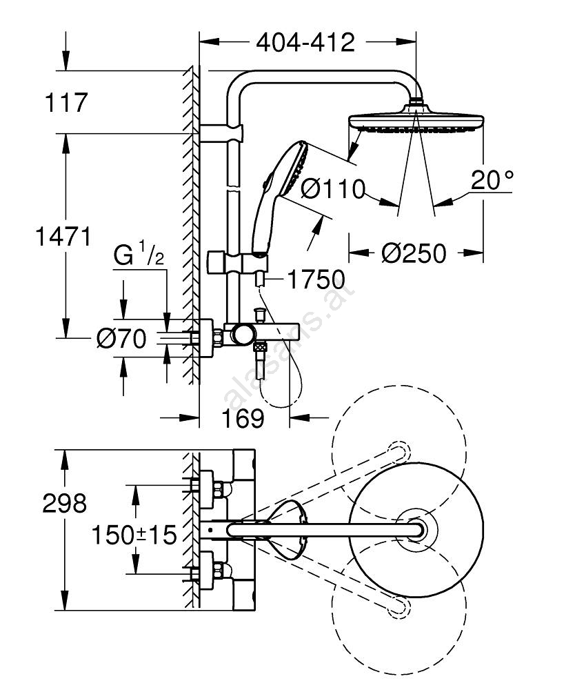 • Horizontaler, schwenkbarer Duscharm 390 mm für flexible Einstellung des Duschwinkels.