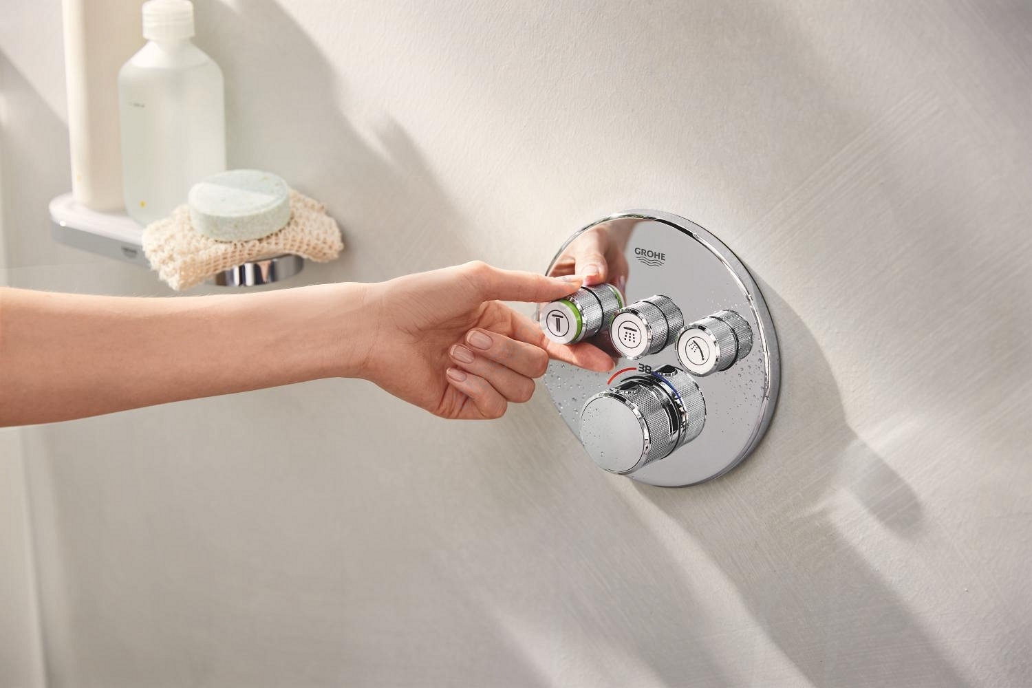 • GROHE SmartControl Bedienung: Drücken zum Ein-/Ausschalten, Drehen zur Einstellung der Durchflussmenge vom sparsamen Modus bis zum Volldurchfluss.