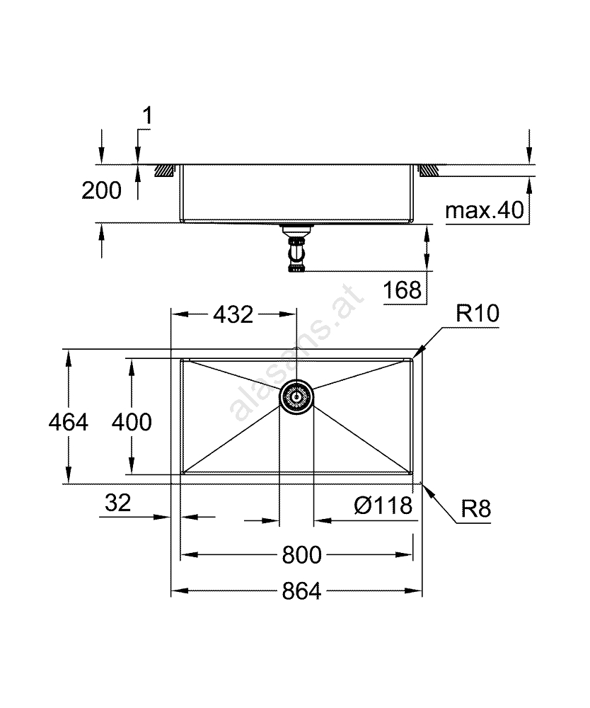 • Abmessungen 864 x 464 mm mit tiefem Becken 800 x 400 x 200 mm für komfortables Spülen großer Gefäße.
