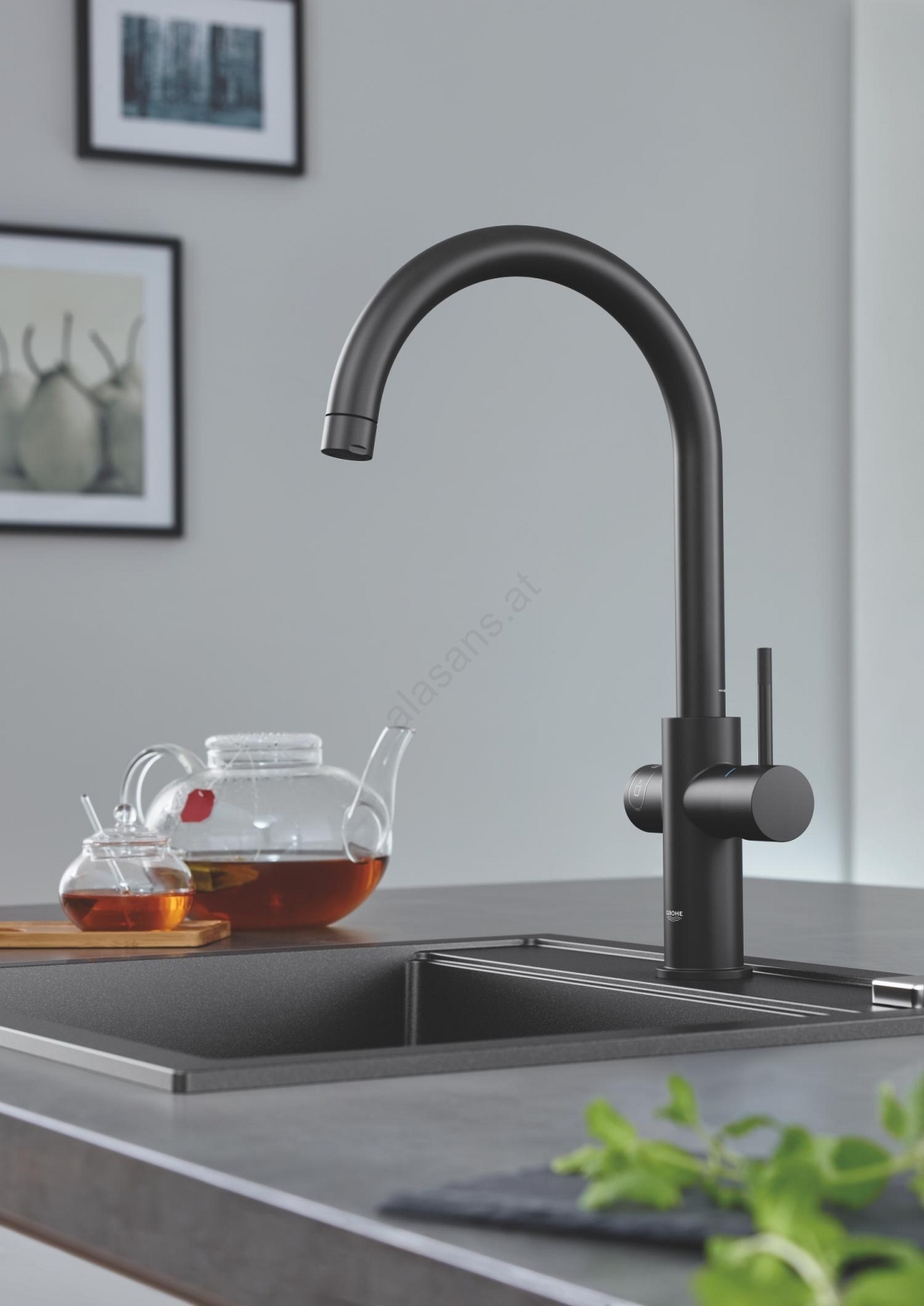 • Quarzkomposit-Spüle GROHE K700 im eleganten Granite-Black-Finish.