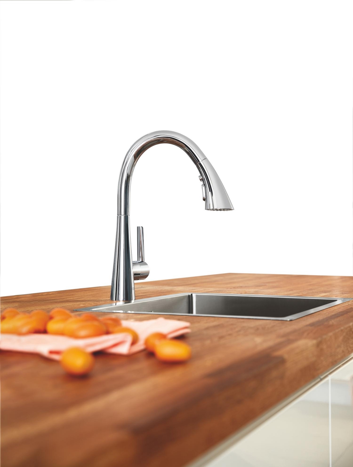 • Ausziehbare Brause mit drei Strahlarten: laminarer Strahl, Duschstrahl und wassersparender GROHE Blade Spray.