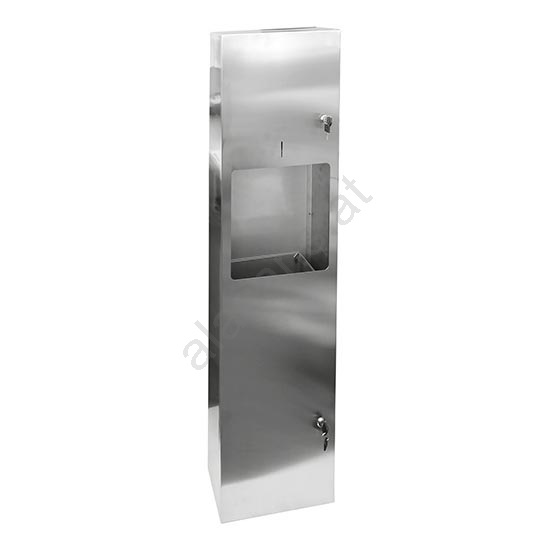 • Freistehender Spender für Papierhandtücher mit integriertem Abfallbehälter.