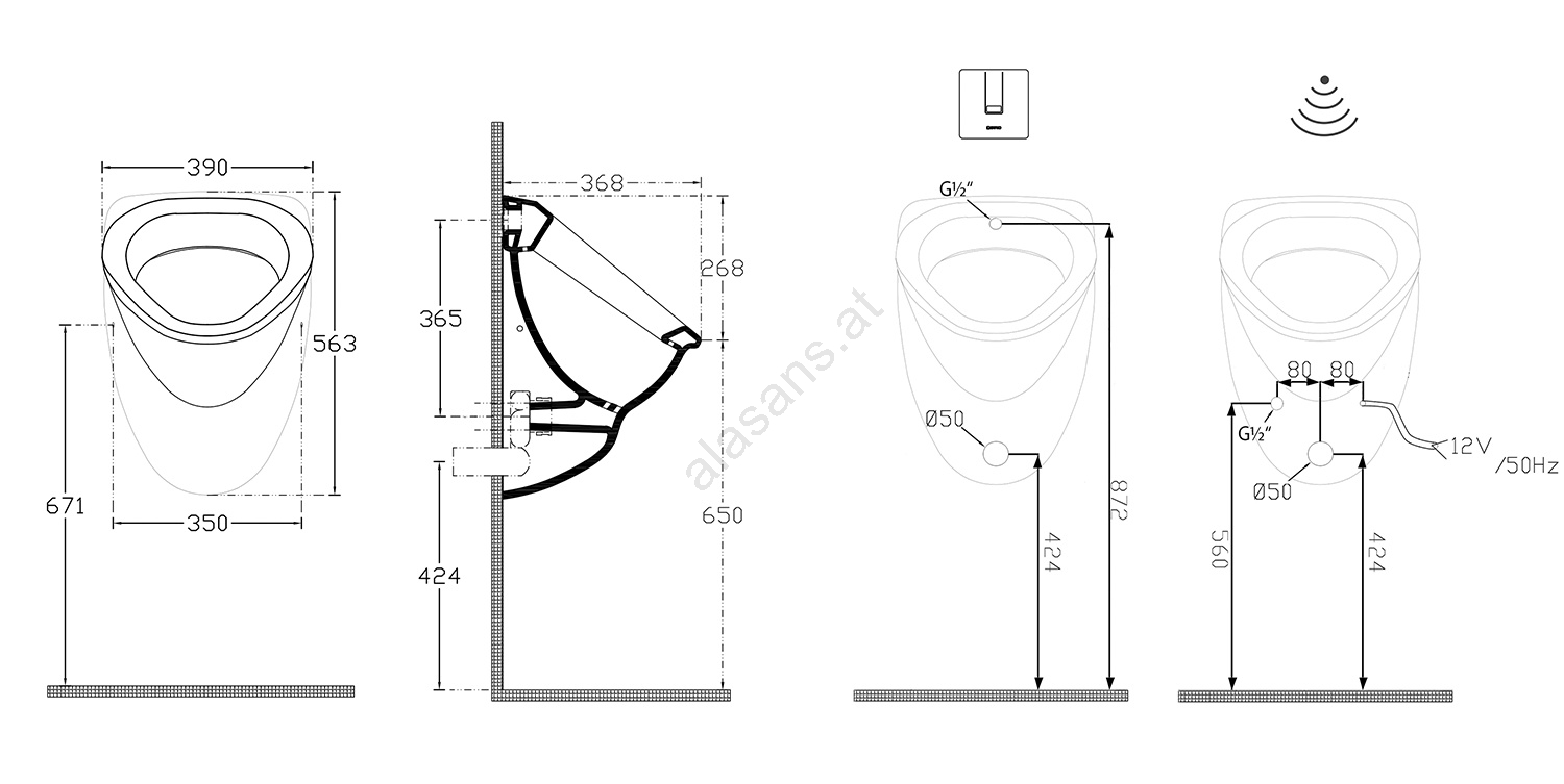 • Das Urinal verfügt über eine verdeckte Befestigung und einen Wasseranschluss ½".