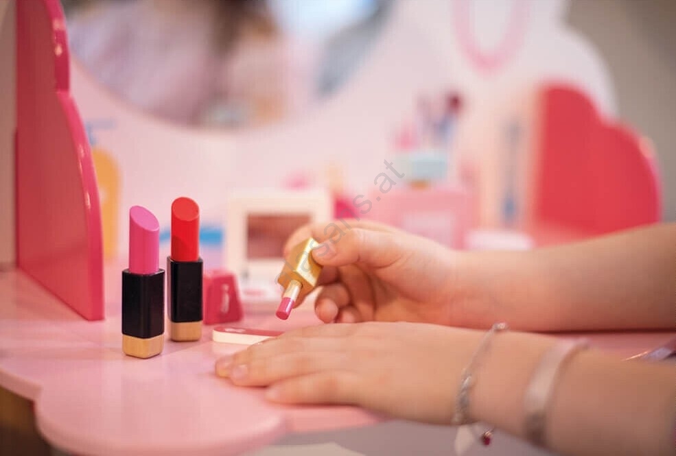 • Zum Tisch gehört ein Holzstuhl sowie weiteres Holz-Zubehör: ein Spiegel, eine rosa Haarbürste, zwei rosa Haarklammern und ein Haargummi, Parfüm, zwei Lippenstifte, Nagellack, eine Nagelfeile und eine Lidschattenpalette.