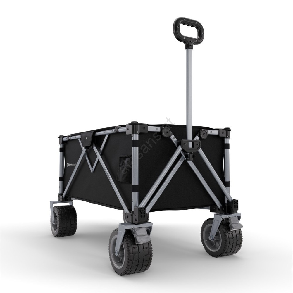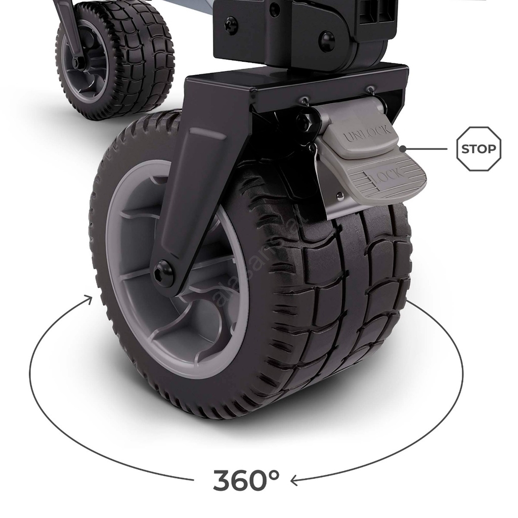 • Große geländetaugliche PVC-Räder mit einer Breite von 10 cm bewältigen mühelos Sand, Gras und Schotter, sodass der Wagen auch auf unebenem Untergrund stabil bleibt.