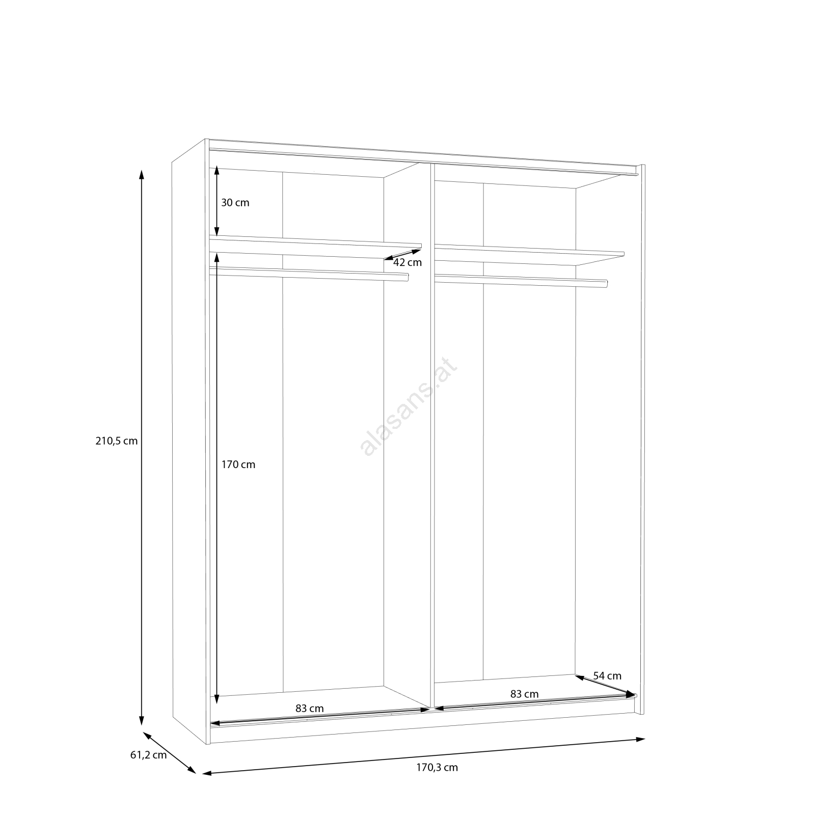 • Der Schrank verfügt über Kleiderstangen, Einlegeböden und großzügigen Stauraum für Kleidung, Taschen und Saisongarderobe.