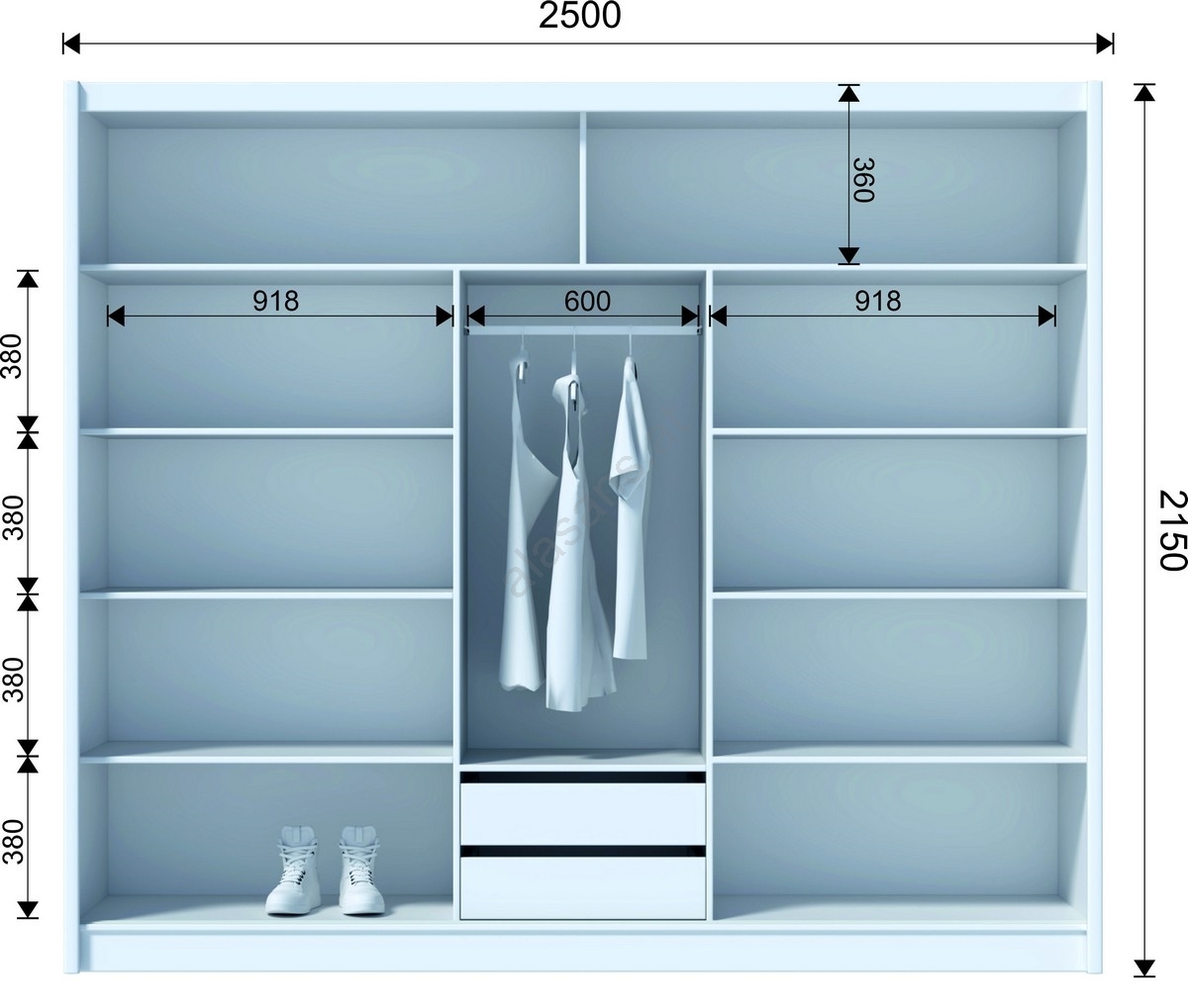 • Der Schrank verfügt über 8 offene Regalfächer, 2 Schubladen, eine Kleiderstange und 2 obere Ablageflächen zur Aufbewahrung von Taschen und saisonalen Gegenständen.