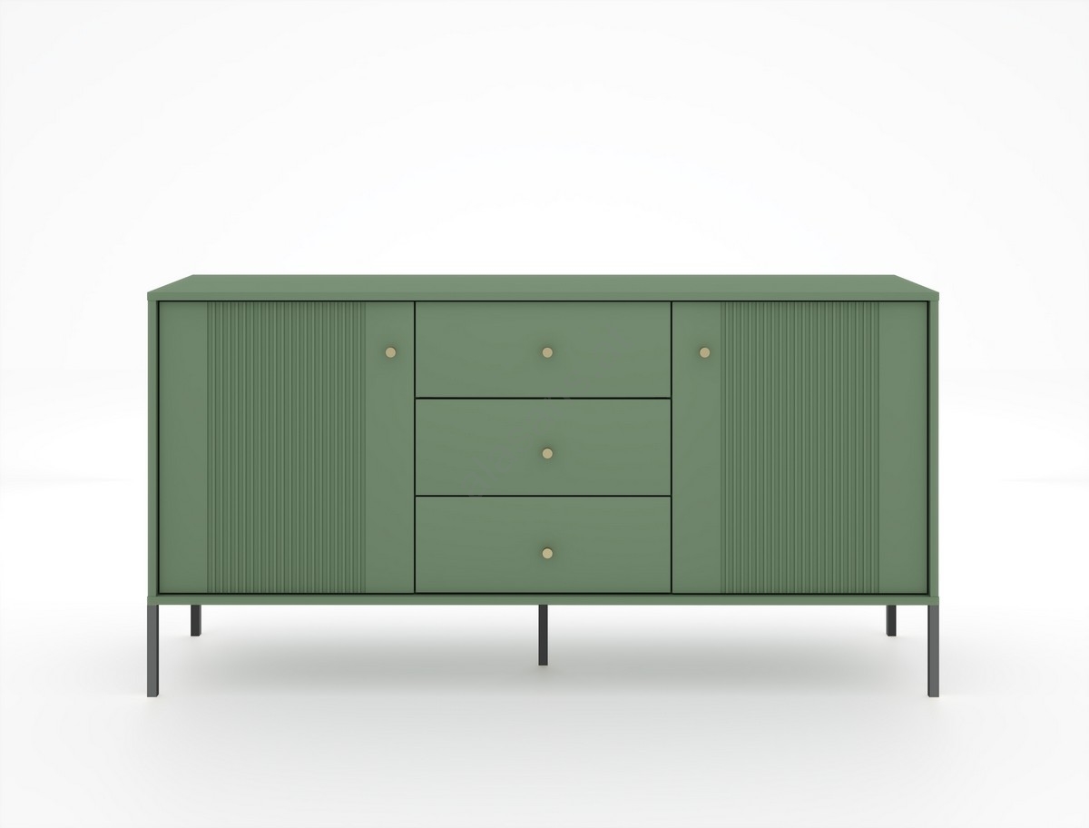 • Sie verfügt über drei mittig angeordnete Schubladen sowie zwei Fächer mit Türen und vertikal geriffelter Front.