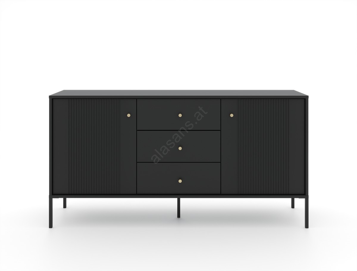 • Sie verfügt über drei mittig angeordnete Schubladen und zwei Fächer mit Türen mit vertikal geriffelter Front.
