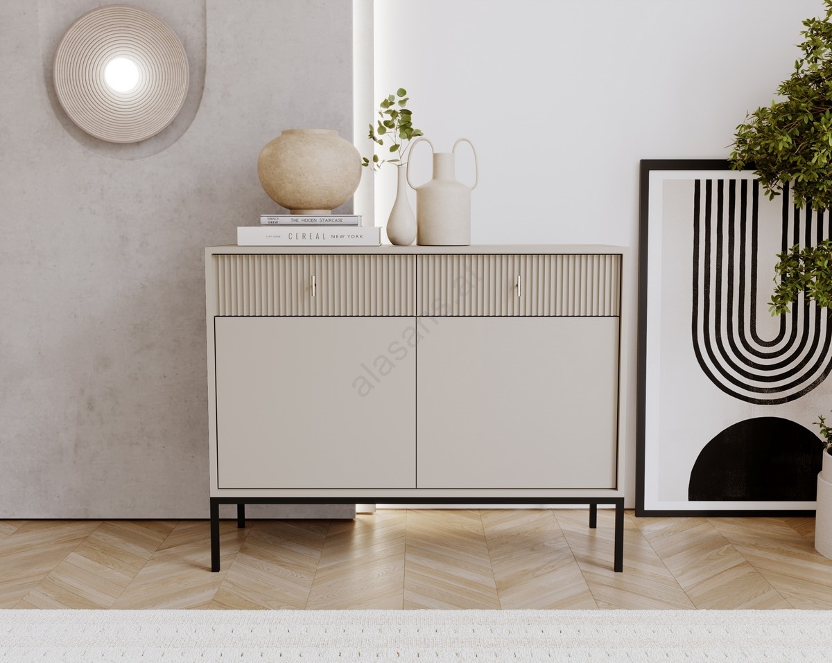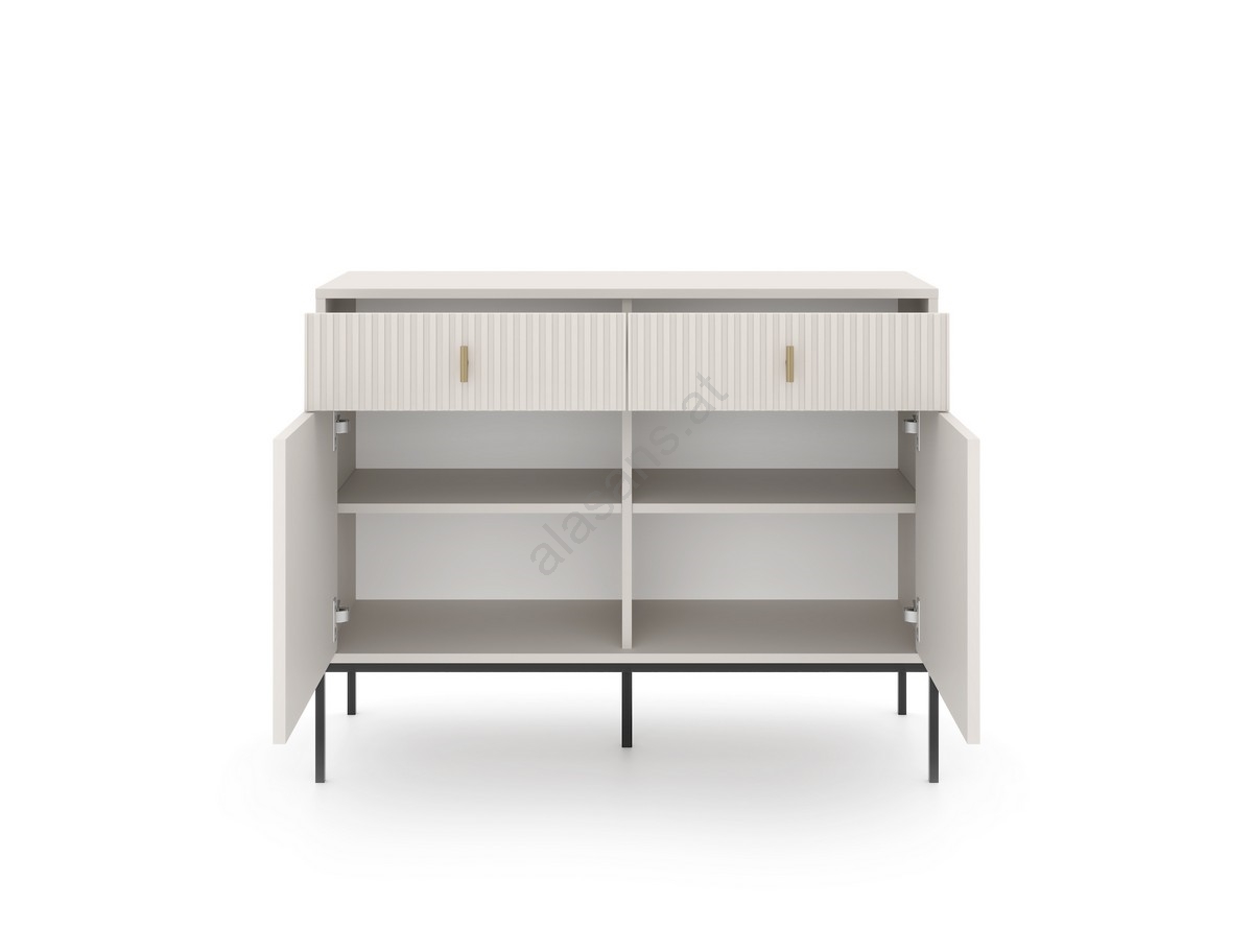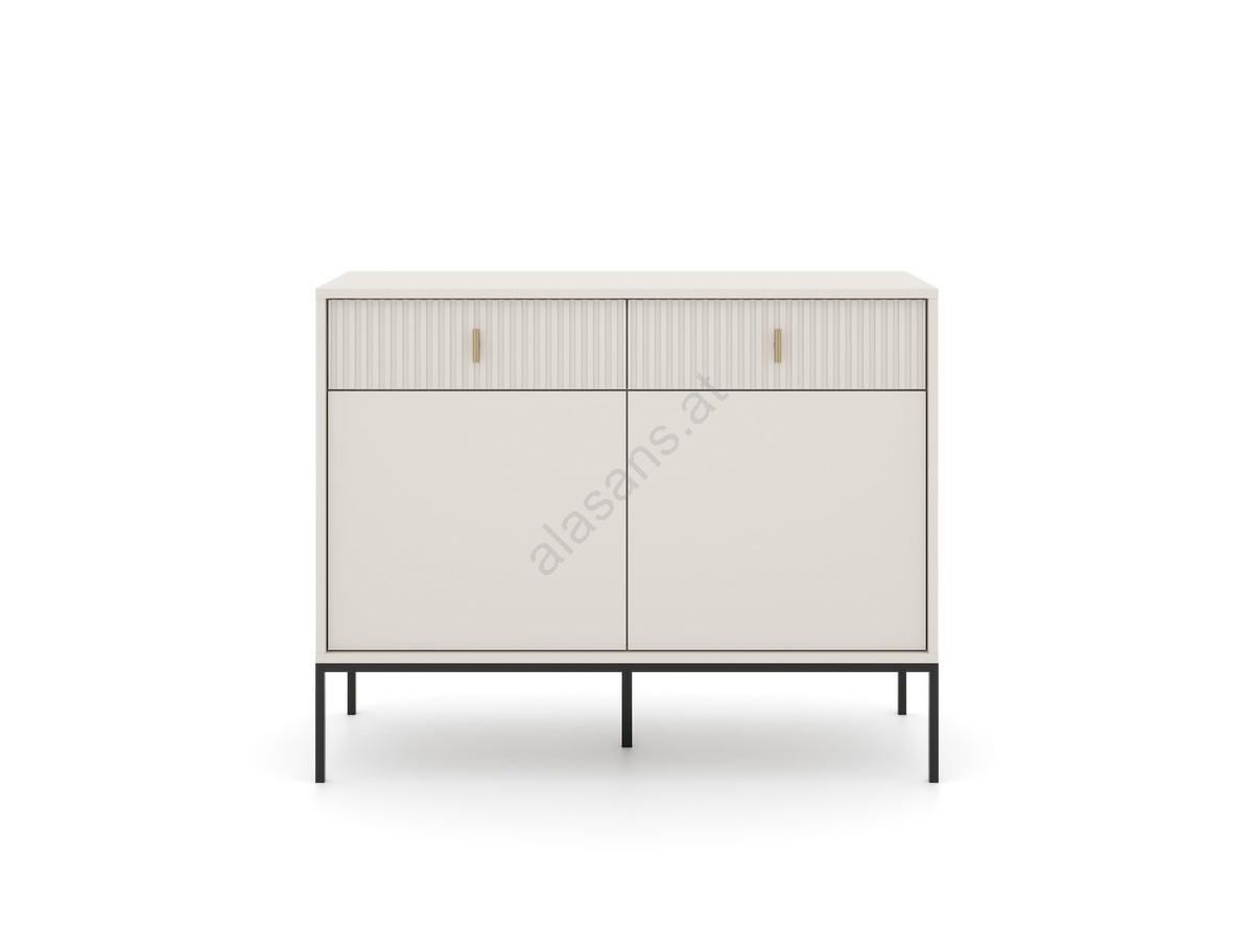 • Sie verfügt über zwei untere Türen mit großzügigem Stauraum sowie zwei Schubladen mit Griffen und vertikal geriffelten Fronten.