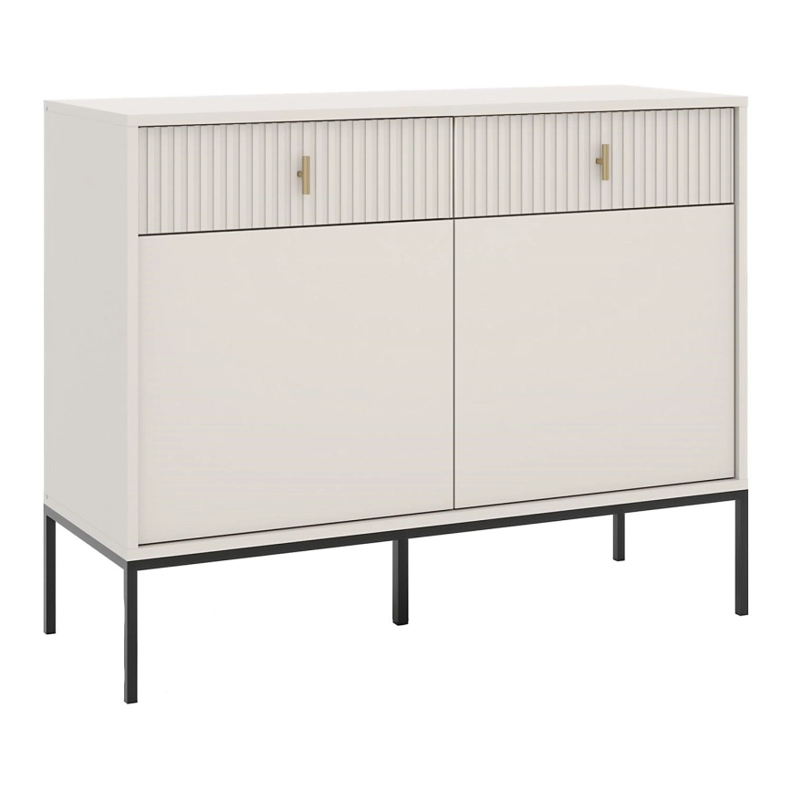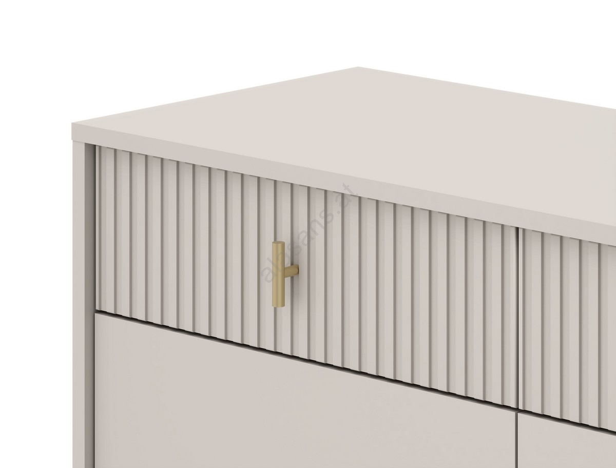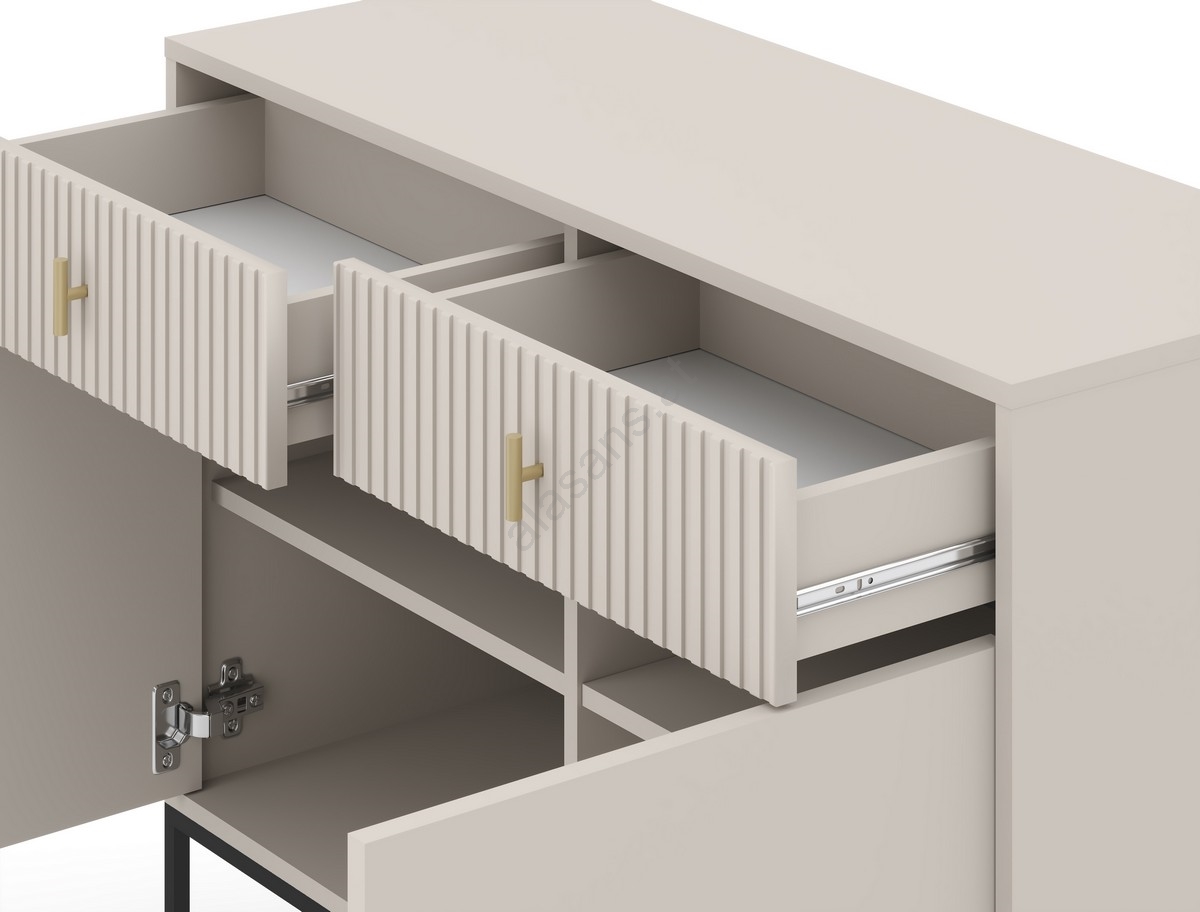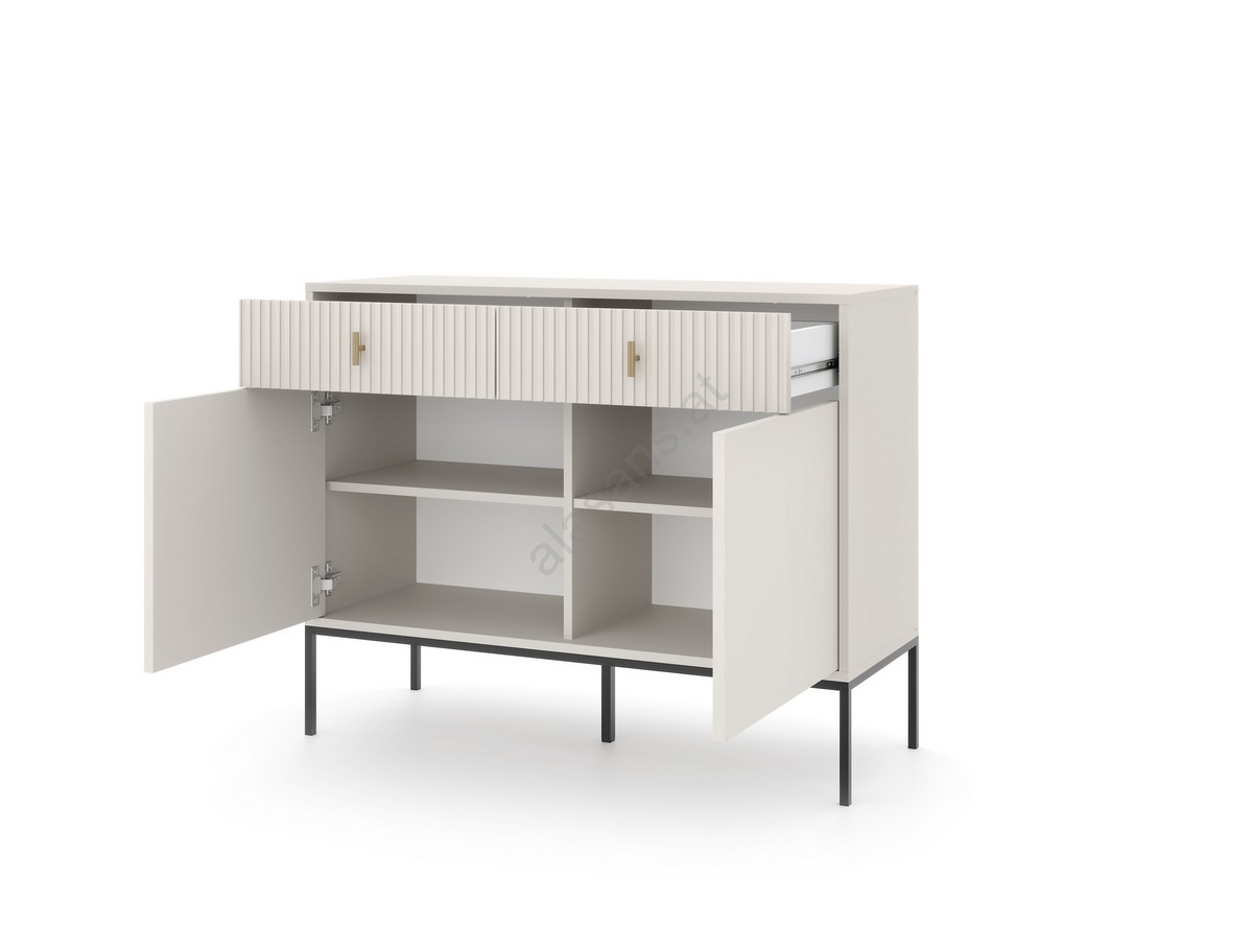 • Sie verfügt über zwei untere Türen mit großzügigem Stauraum sowie zwei Schubladen mit Griffen und vertikal geriffelten Fronten.