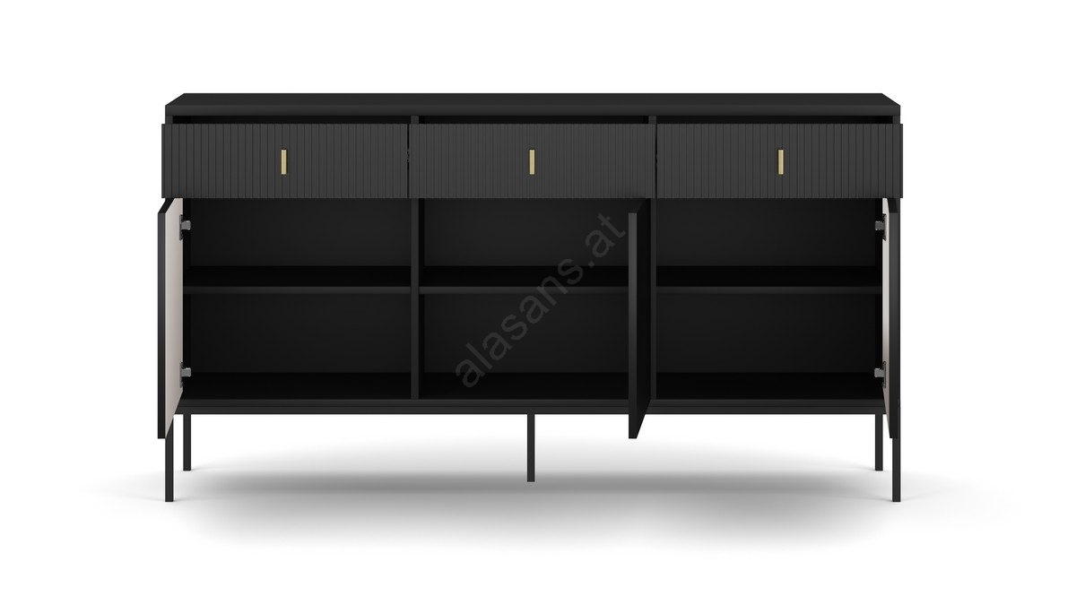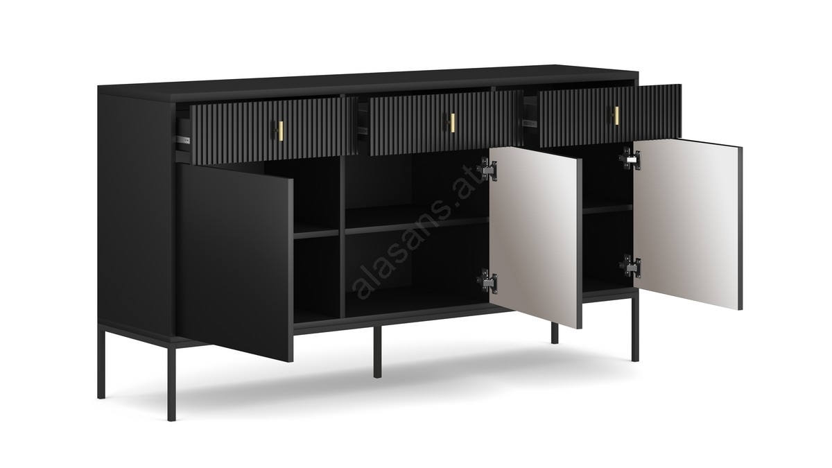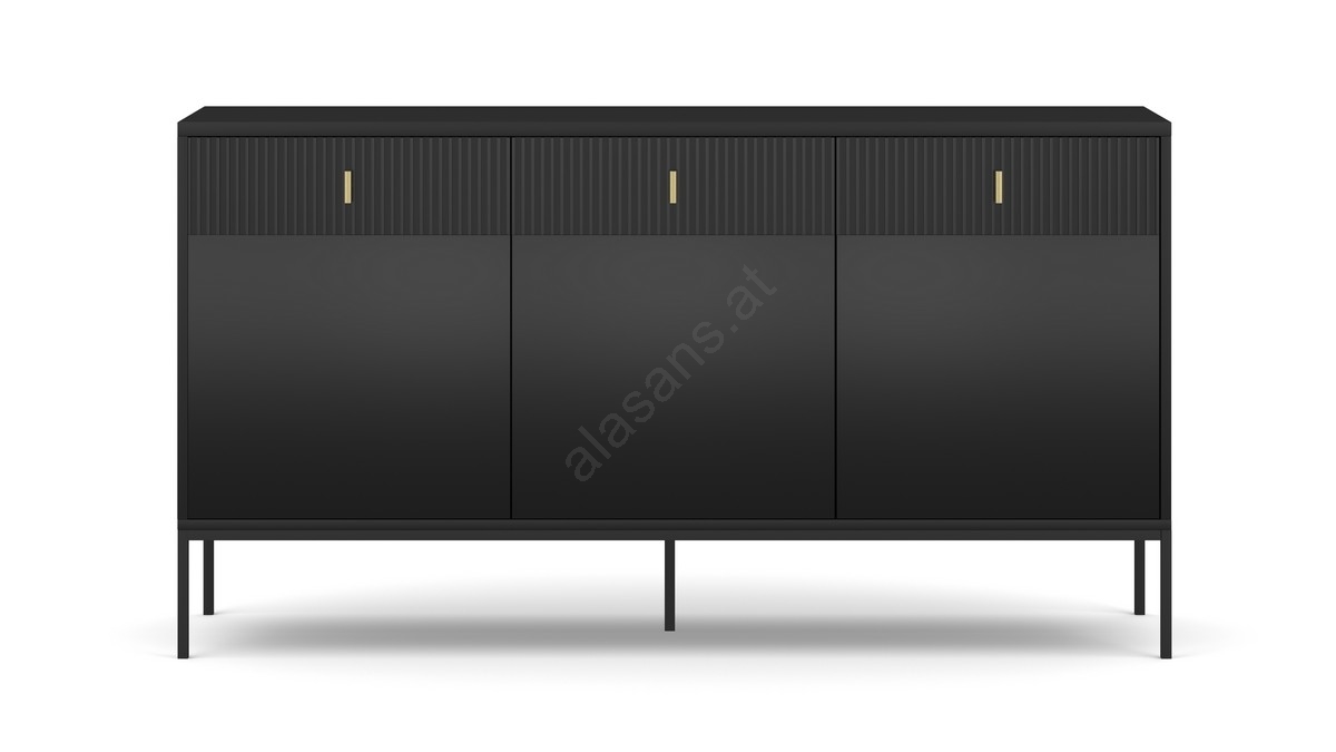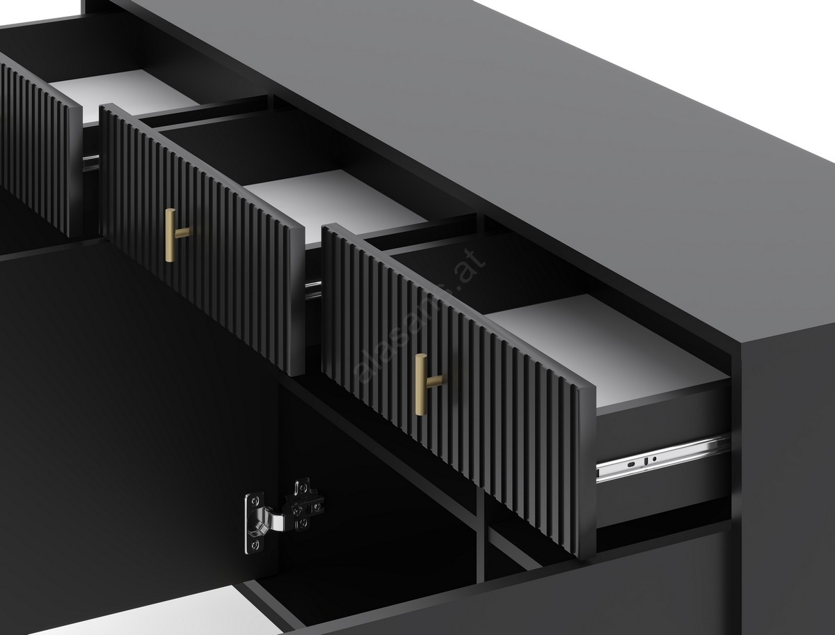 • Sie verfügt über drei untere Türen mit großzügigem Stauraum sowie drei Schubladen mit Griffen und vertikaler Riffelung.