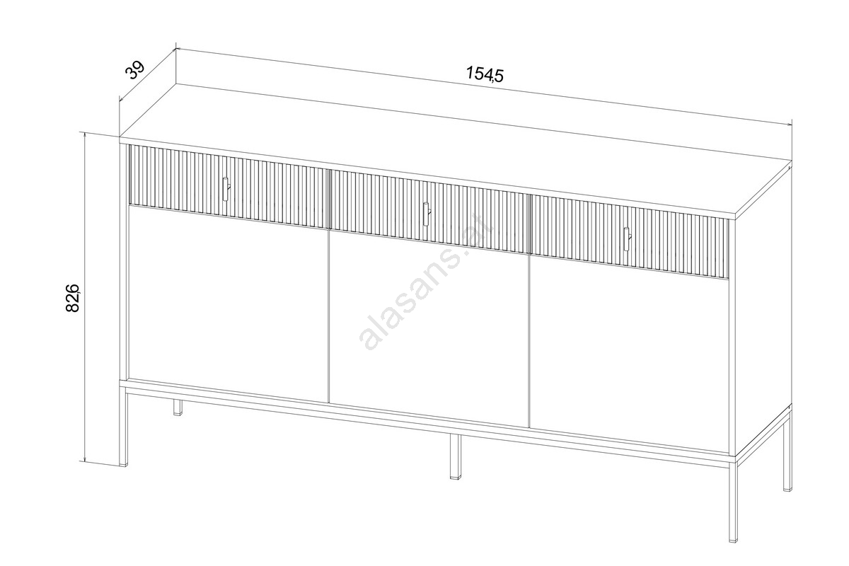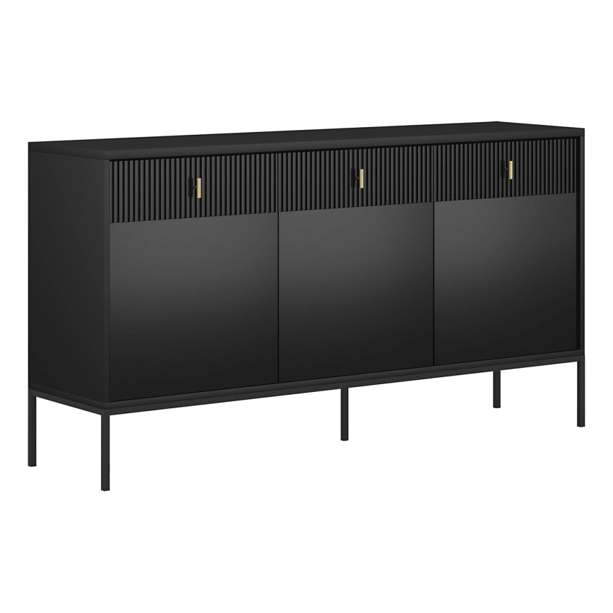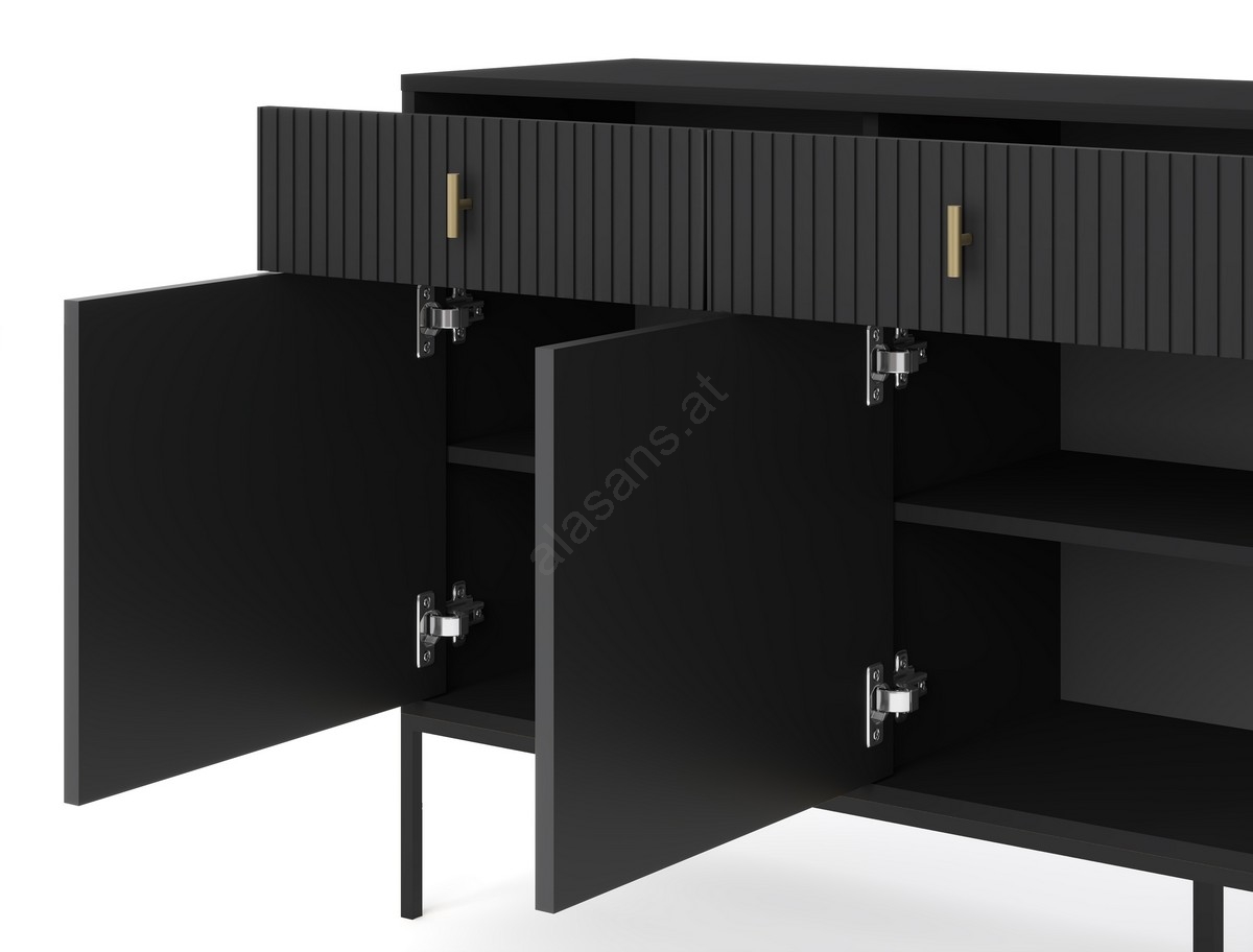 • Sie verfügt über drei untere Türen mit großzügigem Stauraum sowie drei Schubladen mit Griffen und vertikaler Riffelung.