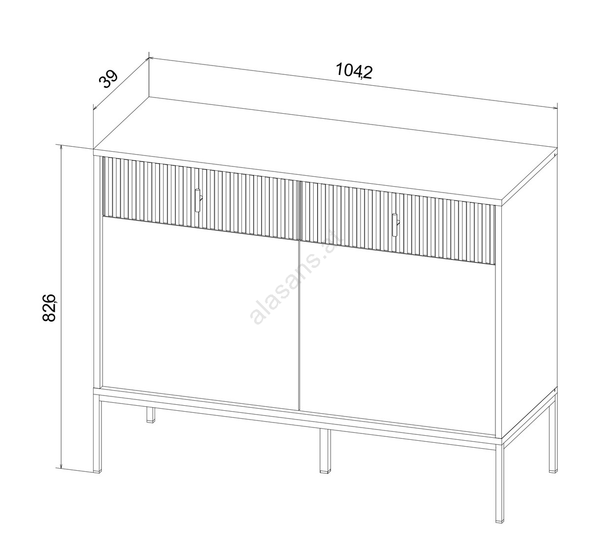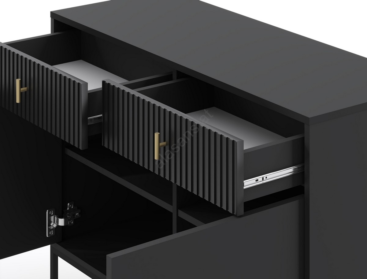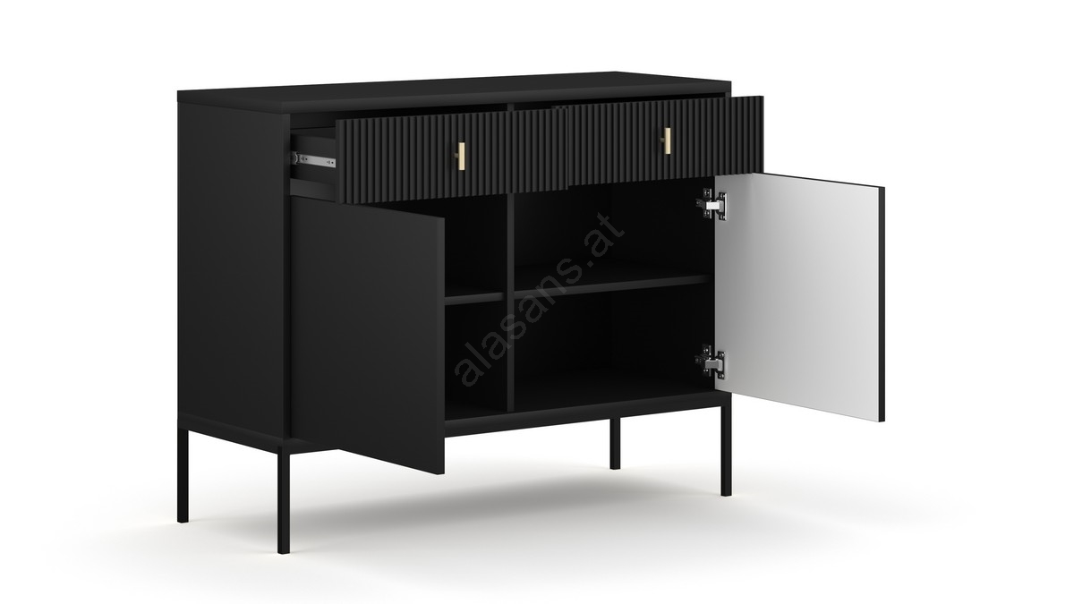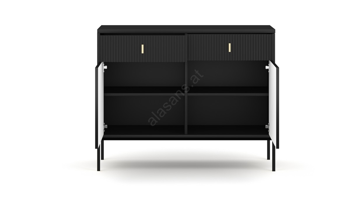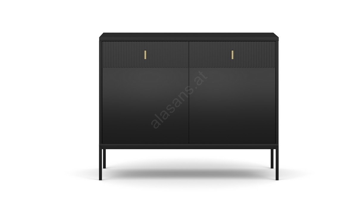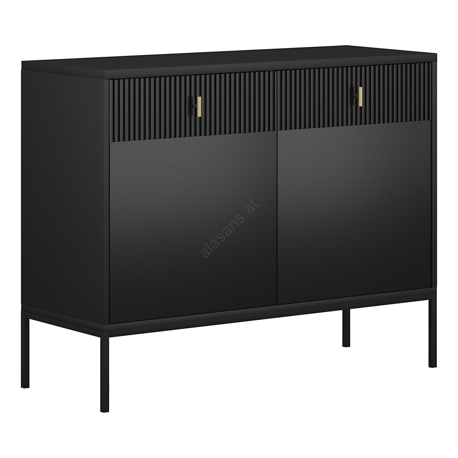• Sie verfügt über zwei untere Türen mit großem Stauraum sowie zwei Schubladen mit Griffen und vertikal gerillten Fronten.
