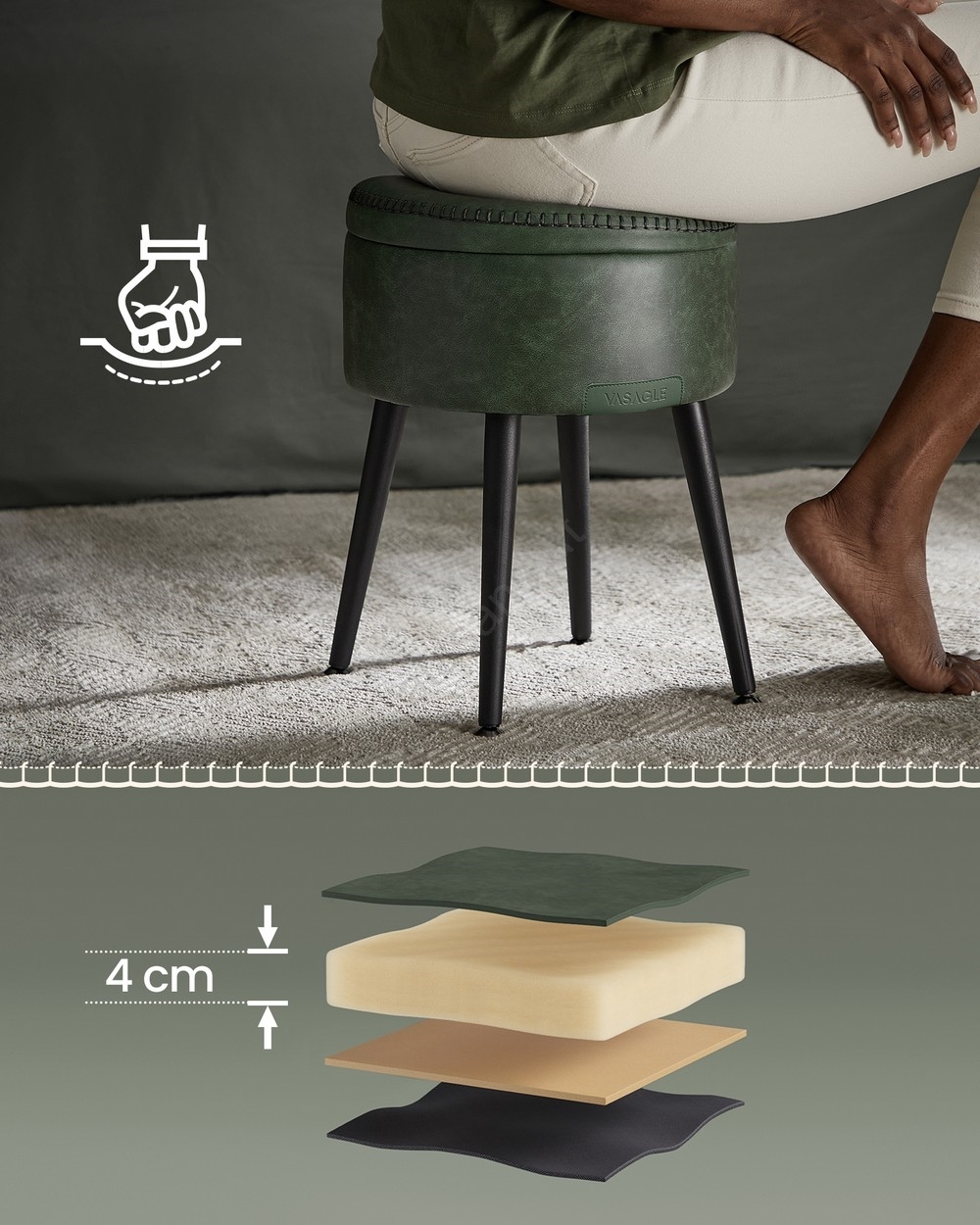 • Im Inneren des Hockers befindet sich ein Fach (9,4 l) zum Verstauen von Elektronik, Büchern, Decken und anderen Kleinigkeiten.