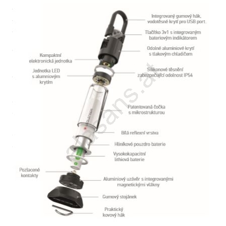 • Die Stromversorgung erfolgt über einen Li-Ion-Akku des Typs 18650 mit 3000 mAh Kapazität, der per USB aufgeladen werden kann; die Lampe kann dabei auch als Powerbank zum Laden kleiner Geräte dienen.
