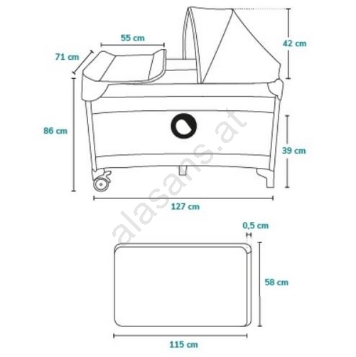 • Im Lieferumfang enthalten: Wickelauflage mit Seitentaschen (für Windeln, Puder etc.), Zubehörkorb mit zwei Fächern, großer Moskitonetz, Verdeck und Spielbogen mit Plüschspielzeugen.