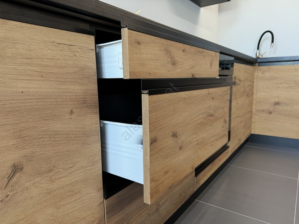 • Oberschränke sind mit Gasdruckfedern ausgestattet, in den Schubladen sind hochwertige verkapselte Metallauszüge verbaut.