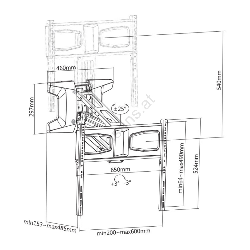 • Bewegung des Fernsehers Auf/Ab bis zu 540 mm bei einem Wandabstand von 153 - 485 mm.