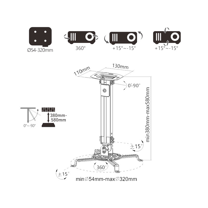 • Dank intelligenter Konstruktion und VESA-Kompatibilität (Lochabstand 54 - 320 mm) ist die Halterung für die überwiegende Mehrheit der Projektoren auf dem Markt geeignet.