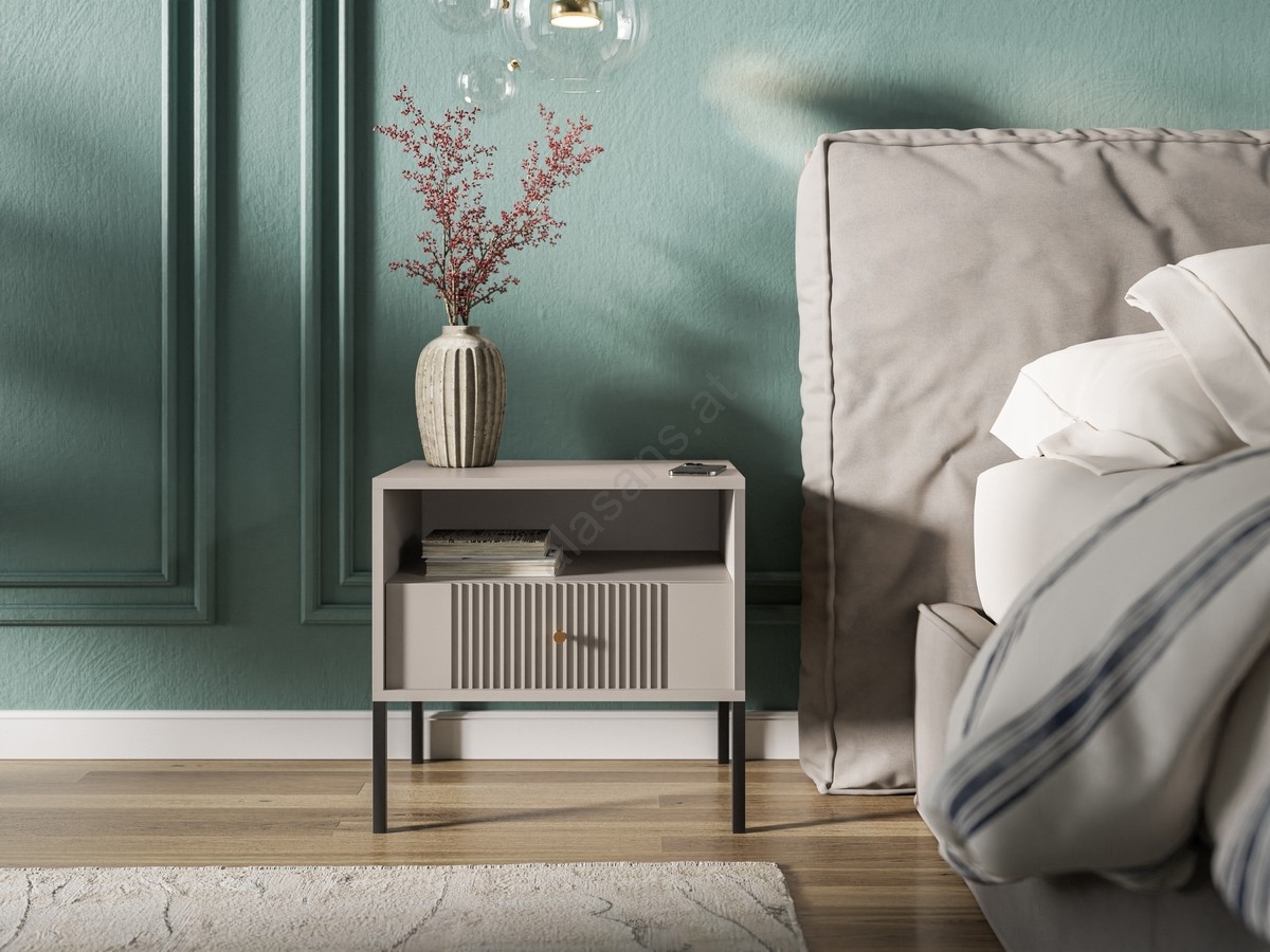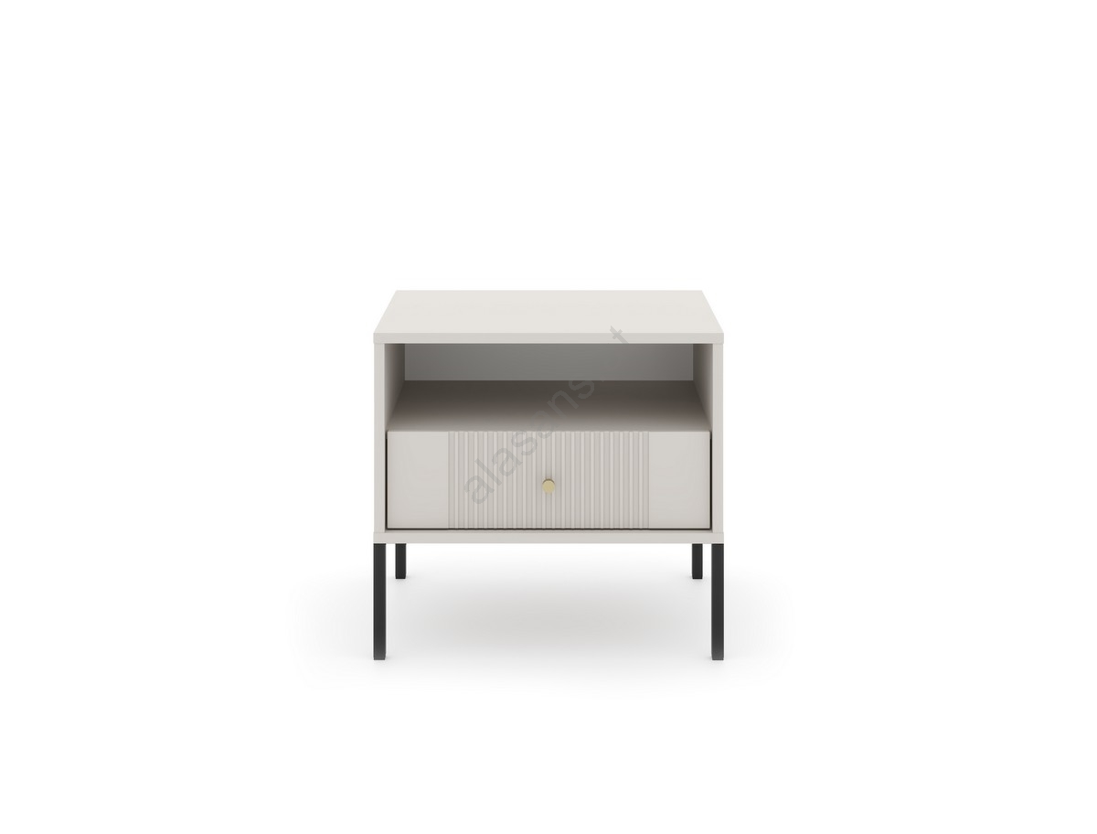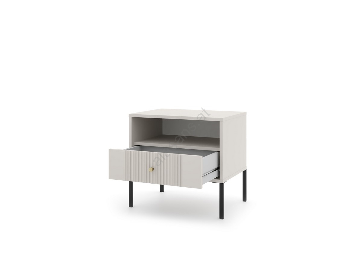 • Er verfügt über ein offenes Fach und eine Schublade mit vertikaler Riffelung für einen raffinierten visuellen Effekt.