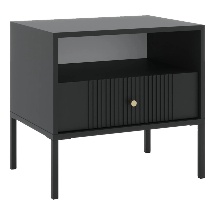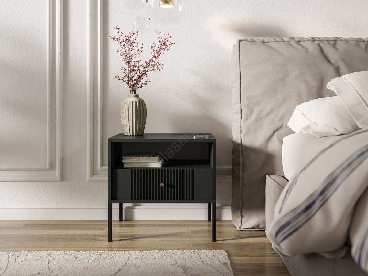 • Er verfügt über ein offenes Fach und eine Schublade mit vertikaler Riffelung für einen raffinierten visuellen Effekt.