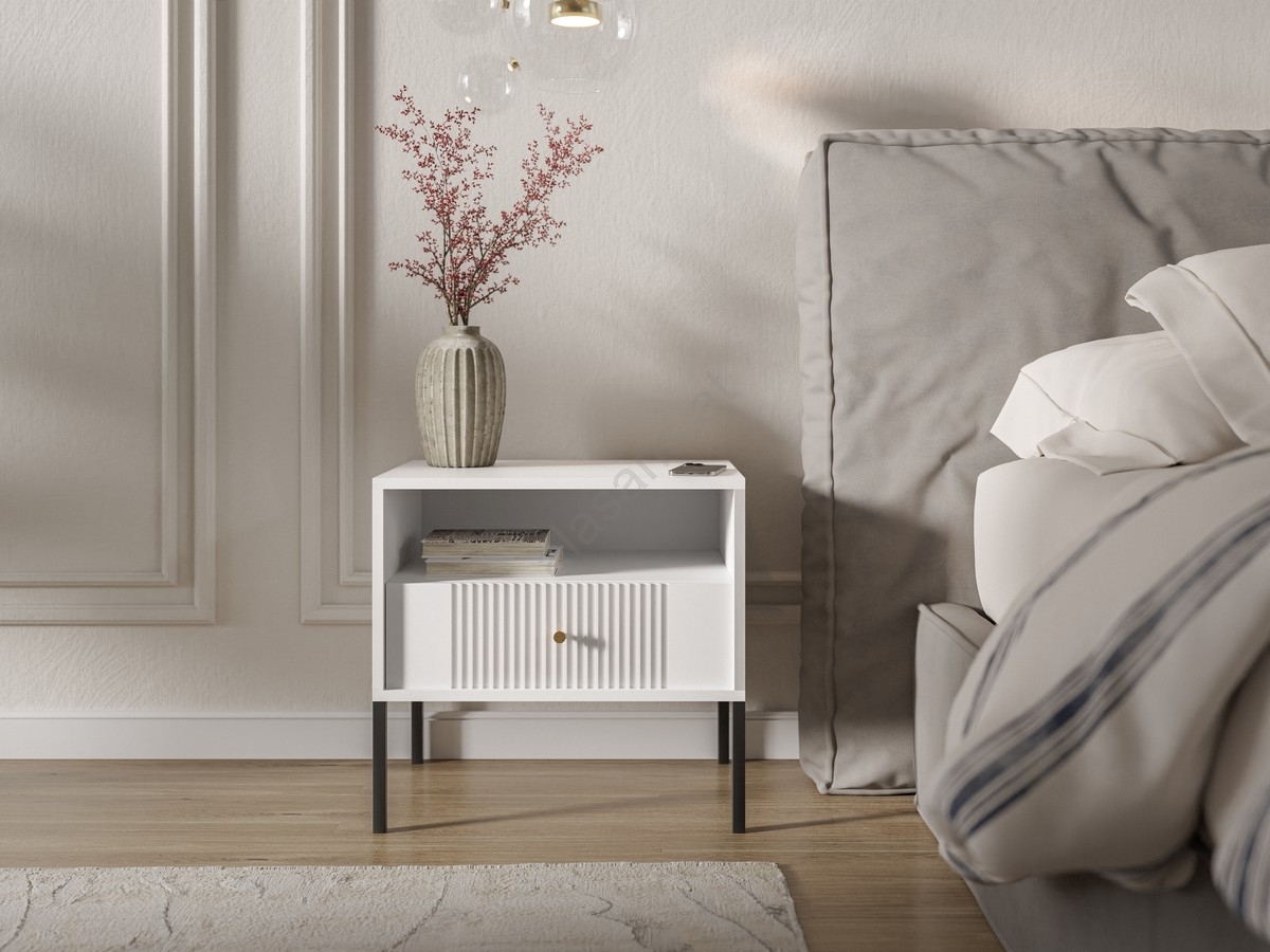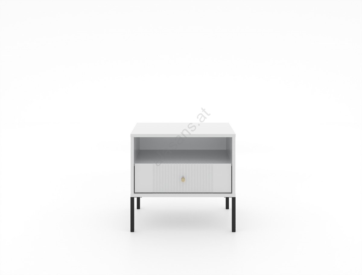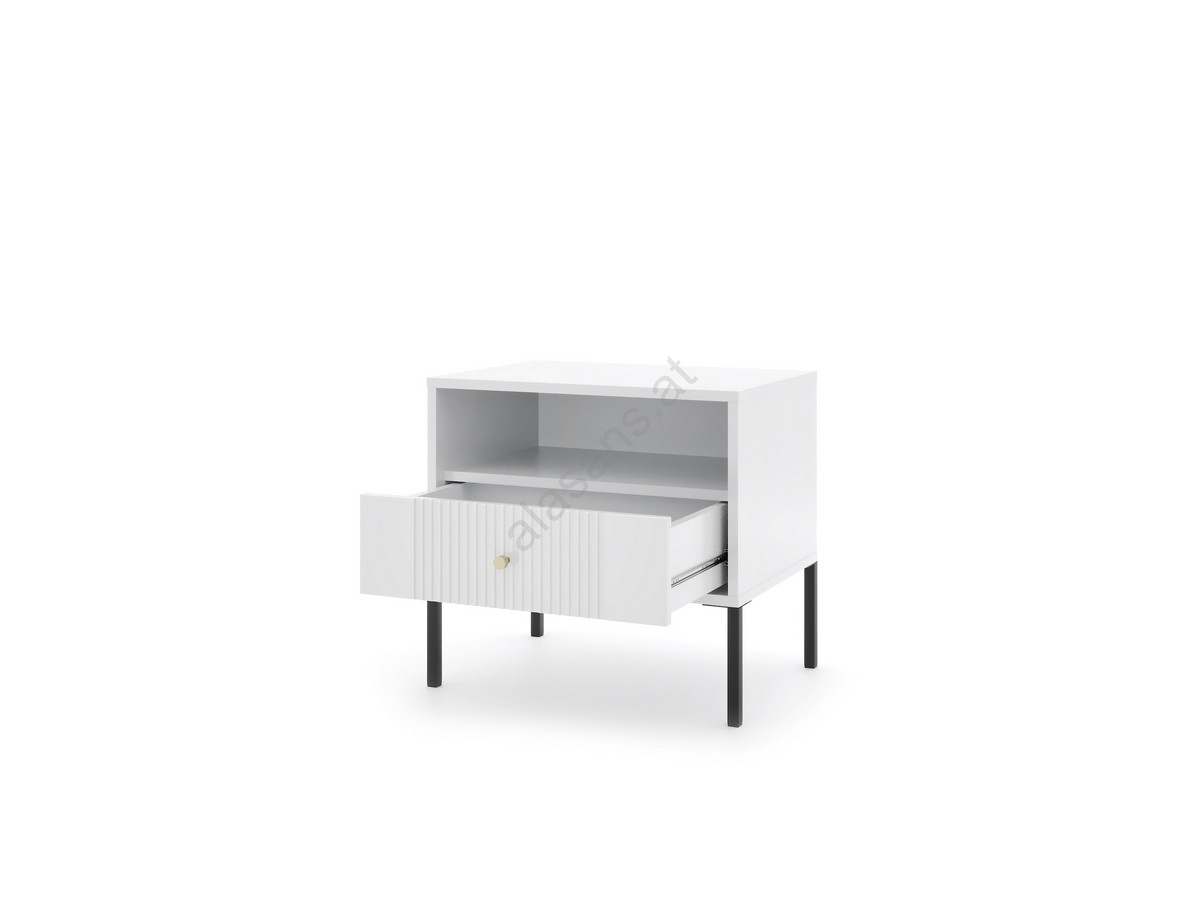 • Er verfügt über ein offenes Fach und eine Schublade mit vertikal gerillter Front für einen raffinierten visuellen Effekt.