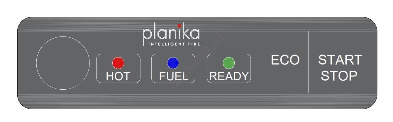 • Das Bedienfeld ermöglicht das manuelle Ein- und Ausschalten des Kamins, das Umschalten in den ECO-Modus und signalisiert gleichzeitig, wann der Brennstofftank leer ist, wann der Kamin bereit zum Einschalten ist und wann er überhitzt ist.