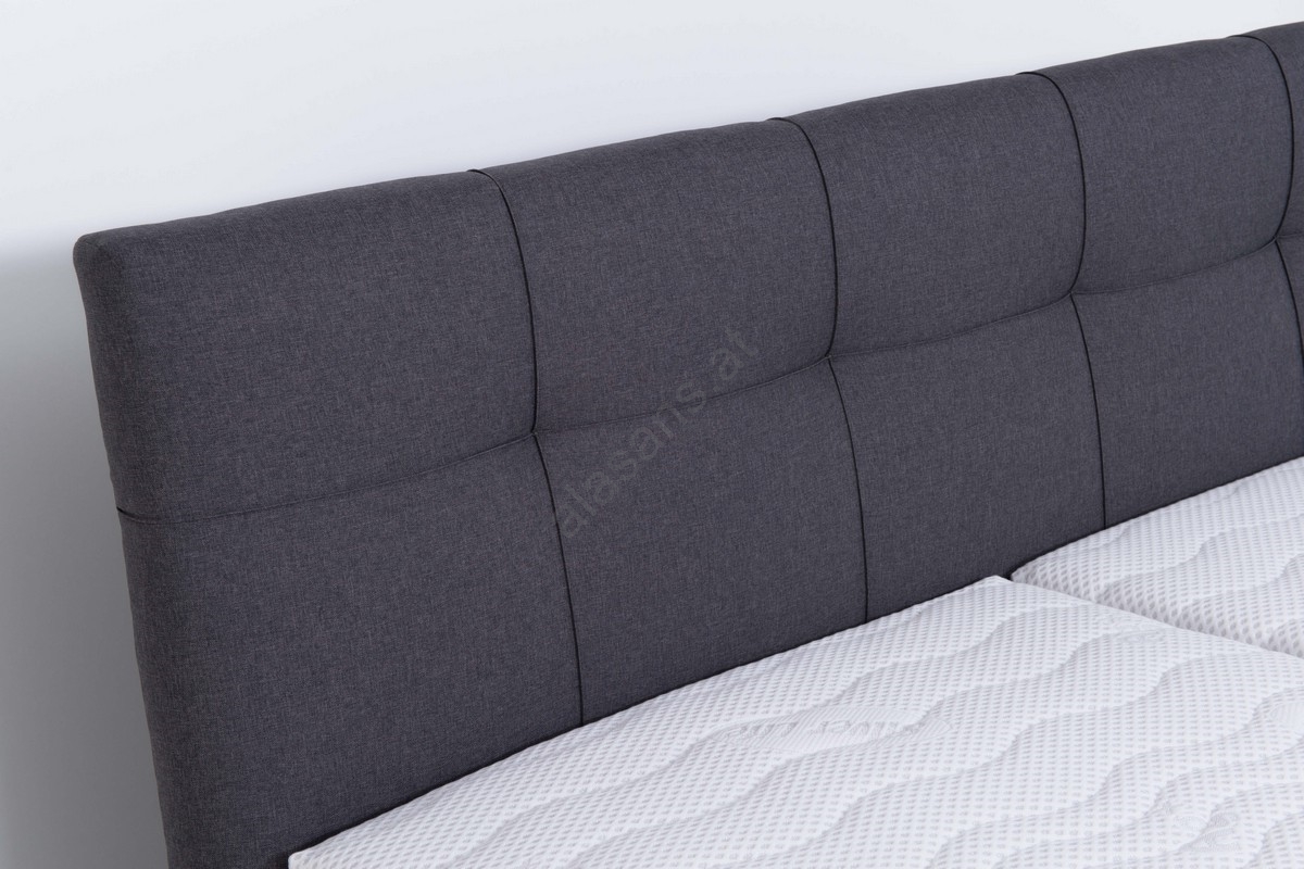 • Gepolstertes Doppelbett mit frei aufliegenden Matratzen besticht durch ein detailreich ausgearbeitetes, elegant gestepptes Kopfteil.