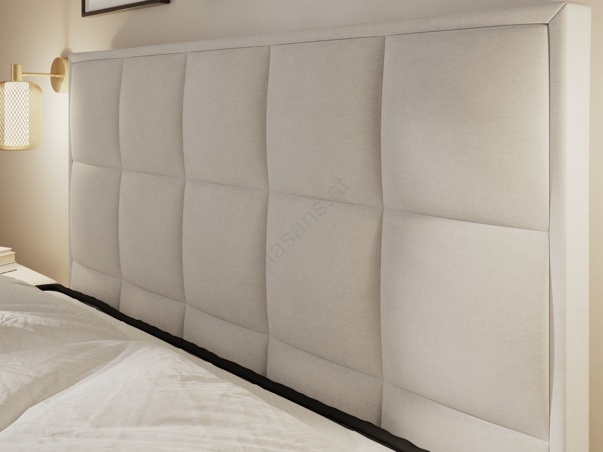 • Dank des hohen Kopfteils mit quadratischer Steppung, der weichen Matratze und des niedrigen, durchgehenden Rahmens wirkt das Bett sehr einladend und gleichzeitig elegant.