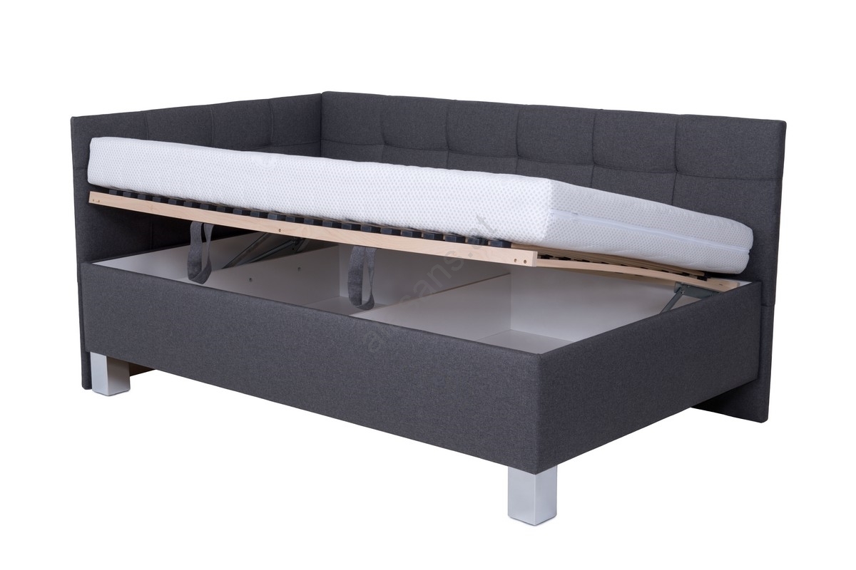 • Das Bett ist seitlich mit einem aufklappbaren System für einfachen Zugang zu einem geräumigen Stauraum ausgestattet, der zusätzlich mit Lüftungsgittern für bessere Luftzirkulation versehen ist.