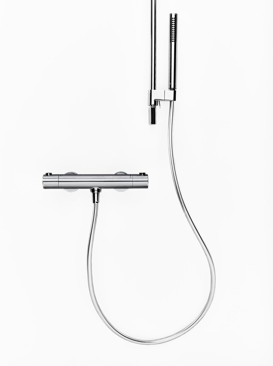 • Wandmontierte thermostatische Duscharmatur Puri, die eine konstante Wassertemperatur gewährleistet und sicheres sowie komfortables Duschen ermöglicht.