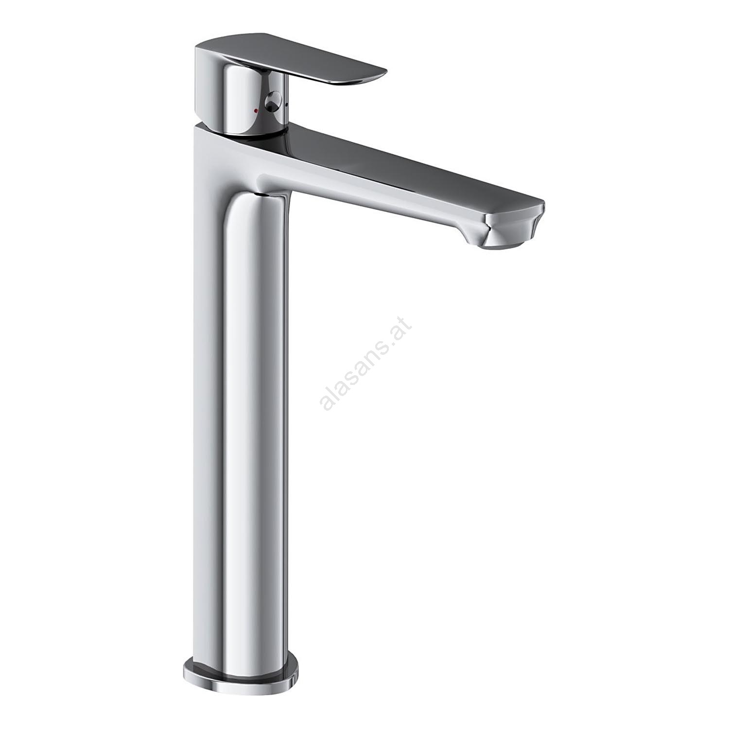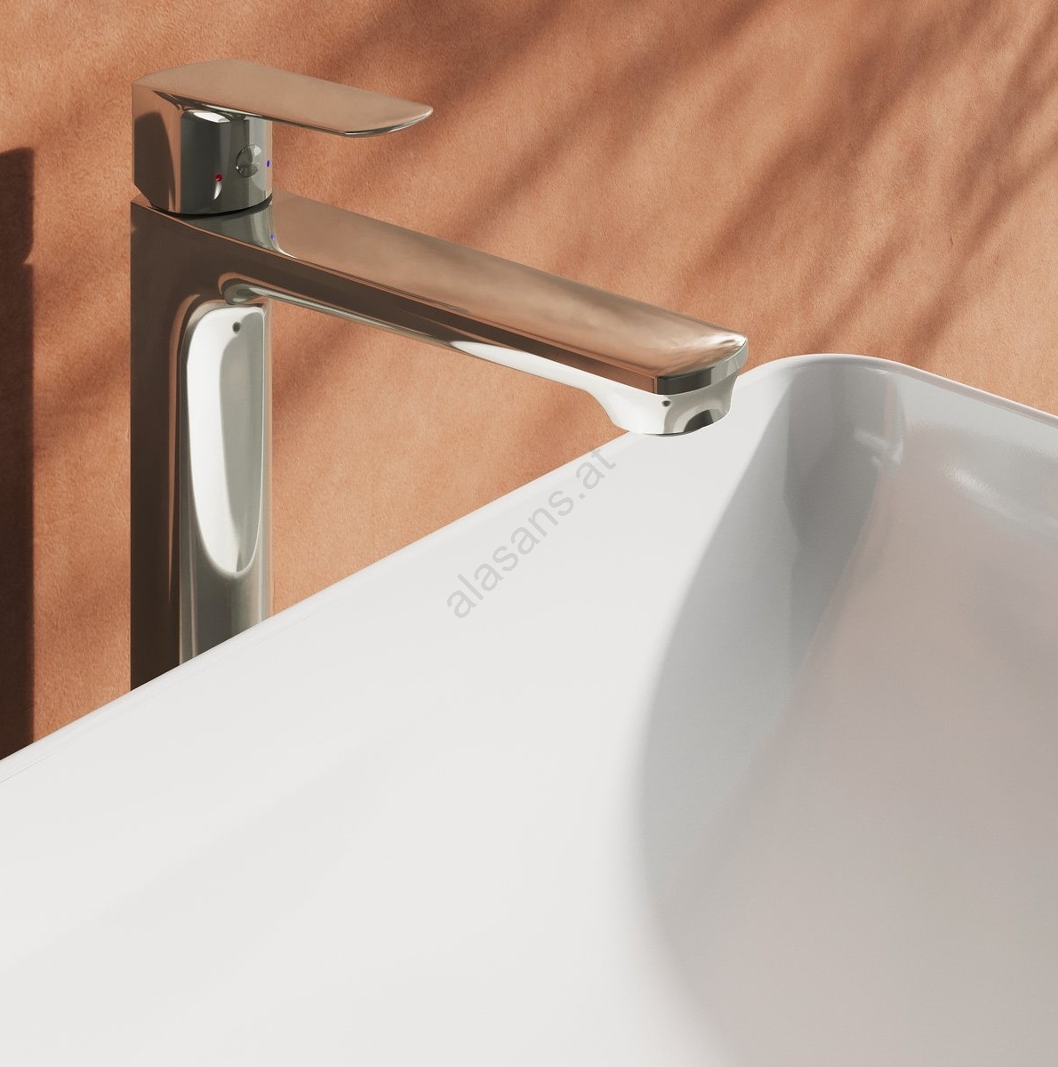 • Die Waschtischarmatur Life in hochglänzendem Chrom hat eine extra verlängerte Höhe von 280 mm und ist ideal für Aufsatzwaschbecken.