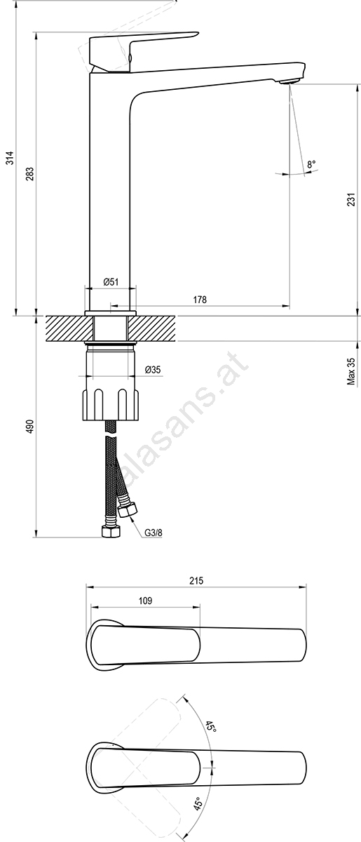 • Die Armatur wird ohne Ablaufgarnitur geliefert und enthält flexible Anschluss­schläuche mit 450 mm Länge und Anschluss G3/8.