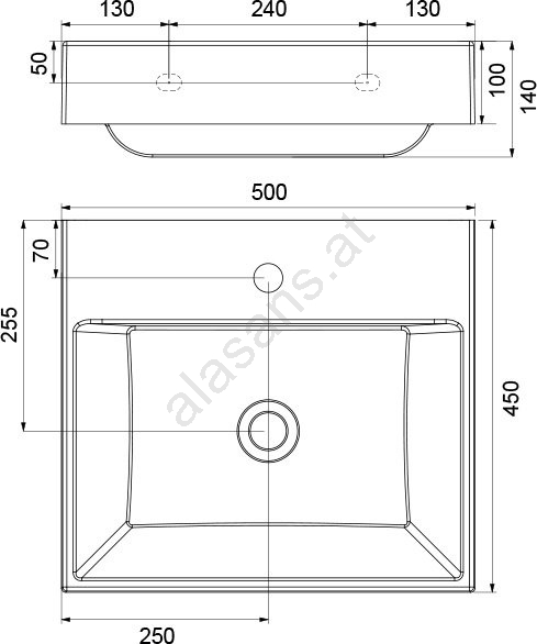 • Das Waschbecken ist ohne Überlauf und verfügt über eine Bohrung für eine Standarmatur mit 35 mm Durchmesser.