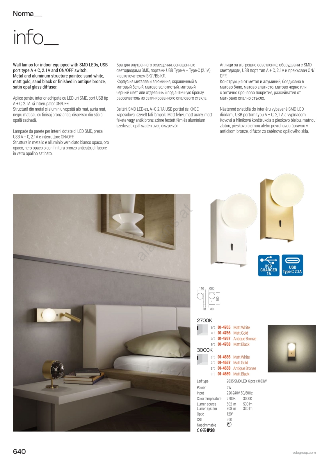 • Redo 01-4657 - LED-Wandleuchte NORMA LED/5W/230V CRI 90 USB weiß/gold