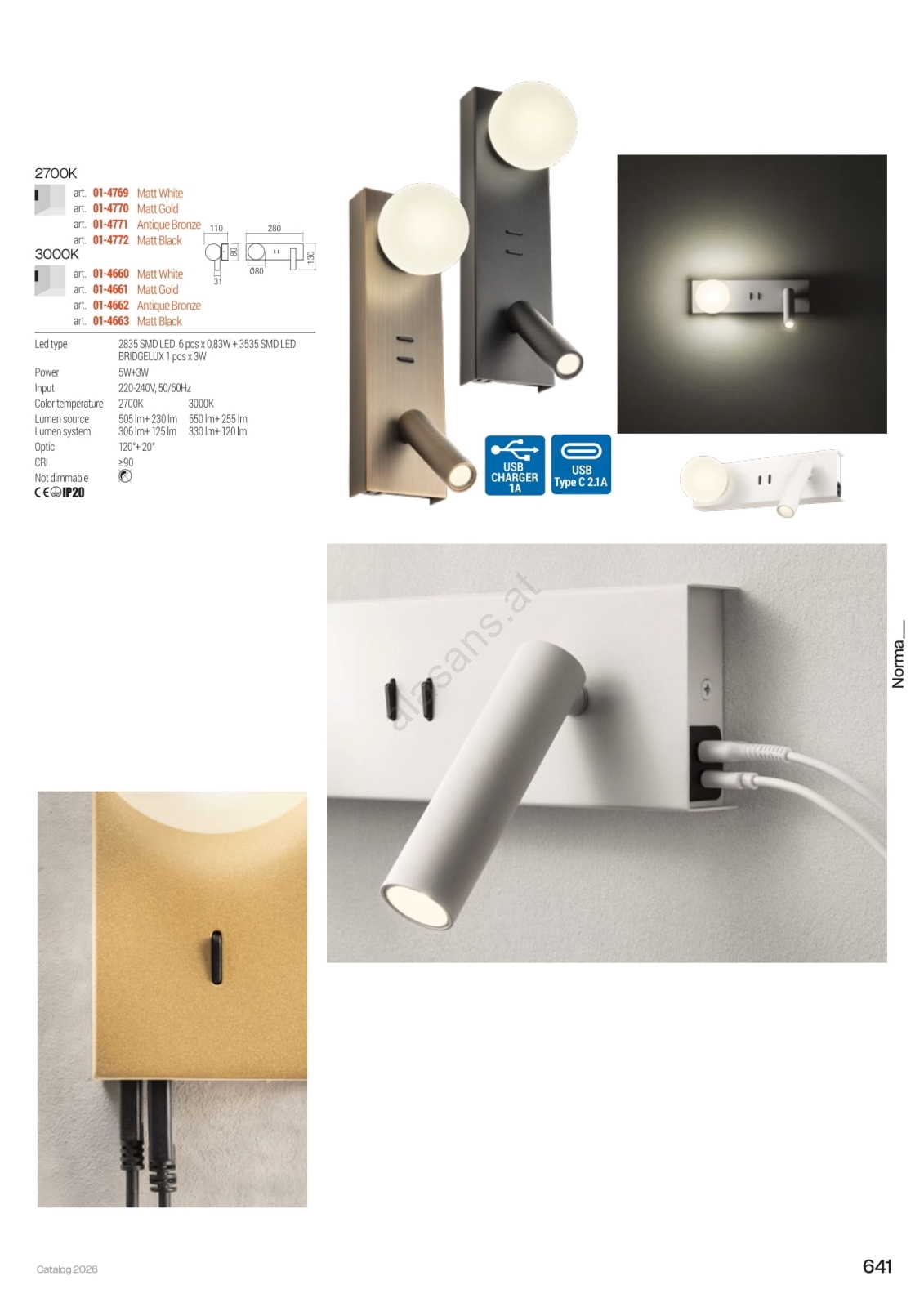 • Redo 01-4662 - LED-Wandleuchte NORMA LED/5W/230V + LED/3W CRI 90 USB weiß/bronze