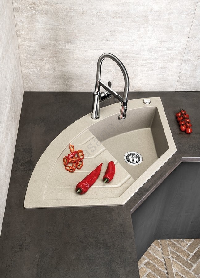 • Die Spüle ist aus Granit gefertigt und weist ein Eckdesign auf.