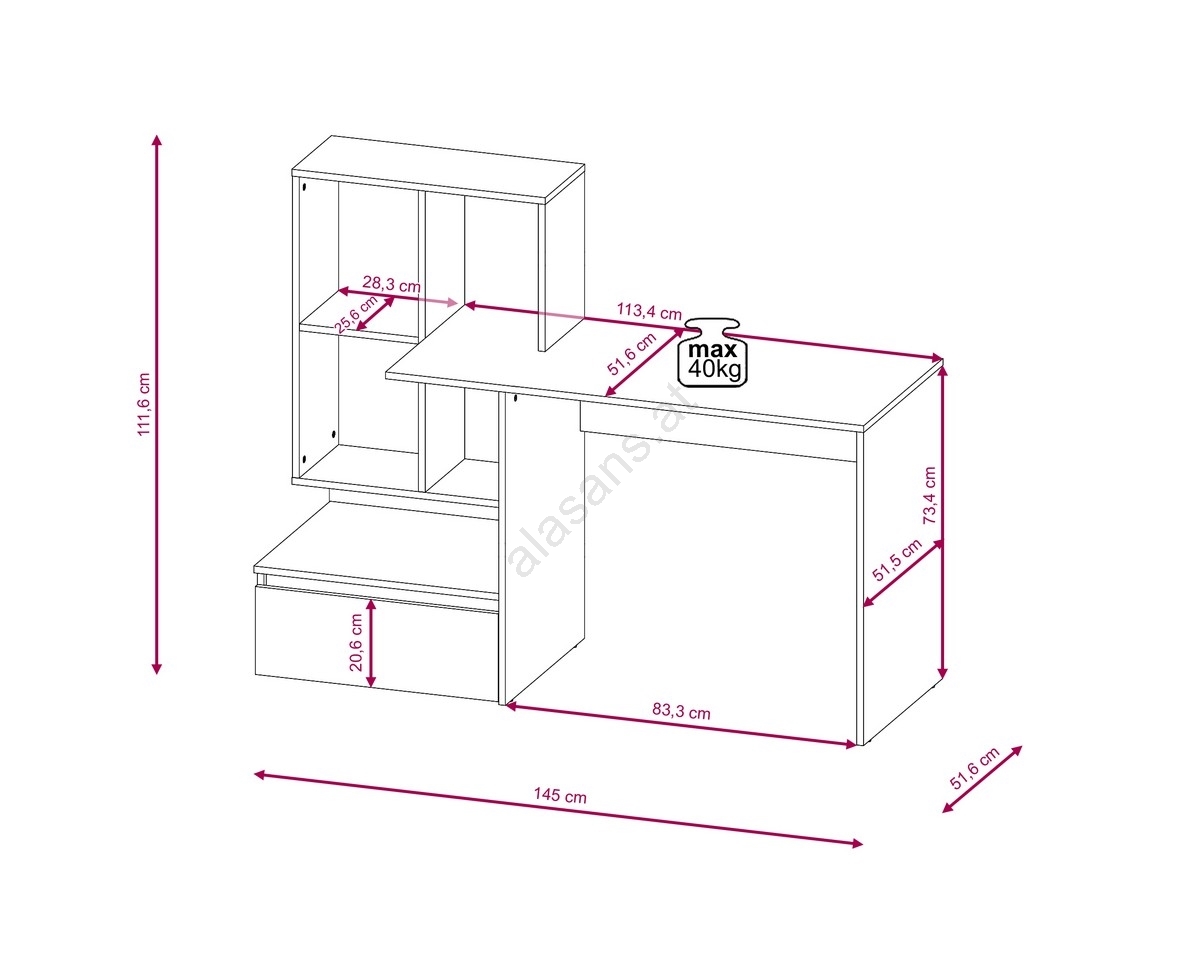 • Die rechteckige Arbeitsfläche ruht auf einem seitlichen Regal mit zwei offenen Ablagefächern, ideal zur Aufbewahrung von Büchern, Büromaterial oder Dekoration.